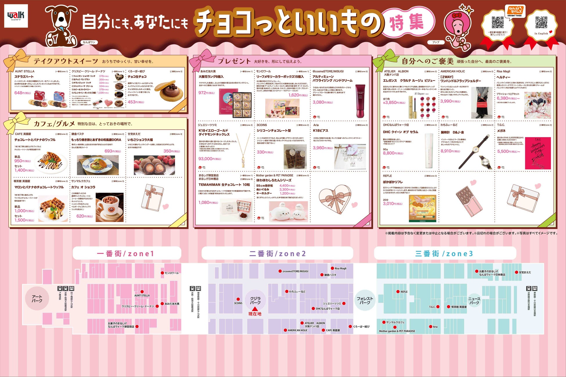 「テイクアウトスイーツ」「カフェ/グルメ」「プレゼント」「自分へのご褒美」の4つのテーマで、なんばウォークのイチオシをパネルでご紹介。相手にも自分にも「チョコっといいもの」がきっと見つかります。