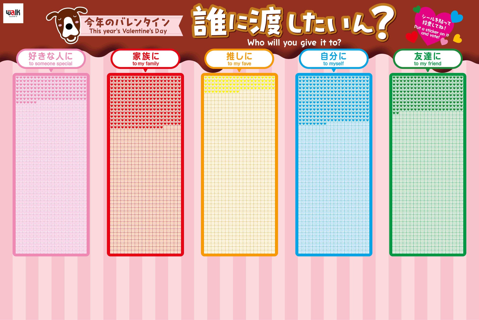 「好きな人に」 「家族に」 「推しに」「自分に」「友達に」の中から、誰にチョコレートを渡したいか、ハートシールを貼って楽しむ「今年のバレンタイン、誰に渡したいん?」投票パネルが登場。