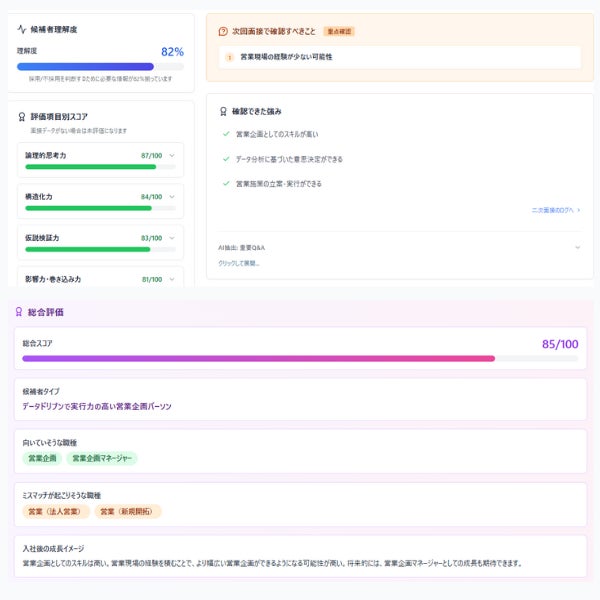 面接中のメモや、終了後の評価シート作成から解放されます。会話をフルテキスト化し、カルチャーマッチやスキル評価を構造化データとして自動生成。