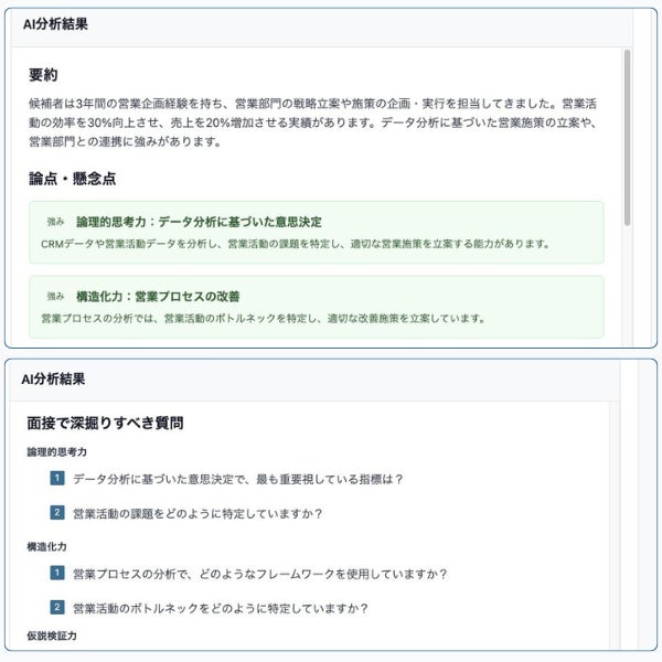 企業ごとの評価基準に合わせて、サマリを作成し数値化。時間がなくてやっていなかった面接設計、面接で聞くべき深堀質問も抽出します。