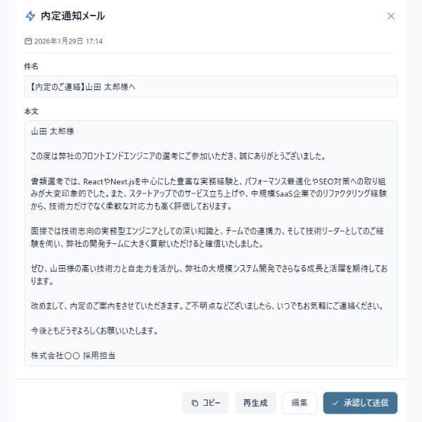 その他大勢と一緒のテンプレは使う必要はありません。面接での会話内容やレジュメの特記事項を踏まえ、一人ひとりにパーソナライズされた温かみのある文面を1クリックで生成。