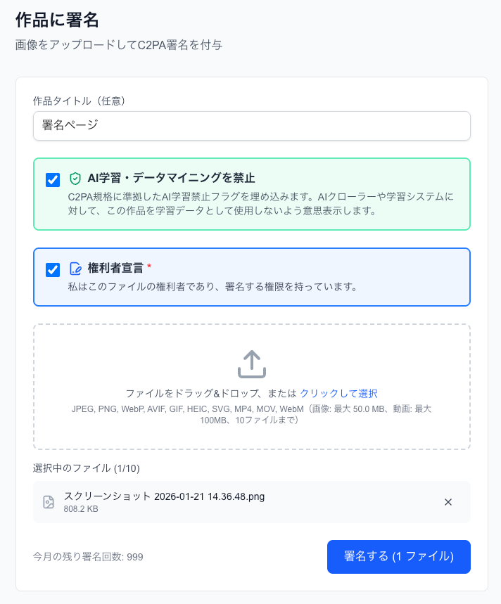 作品ファイルにC2PA規格のデジタル署名を付与します。