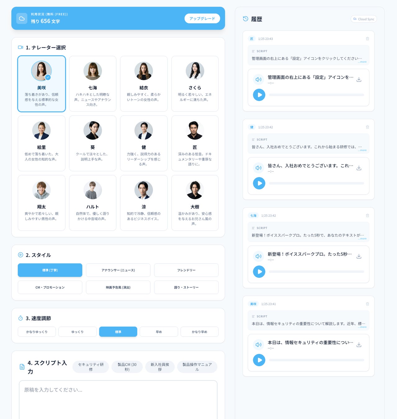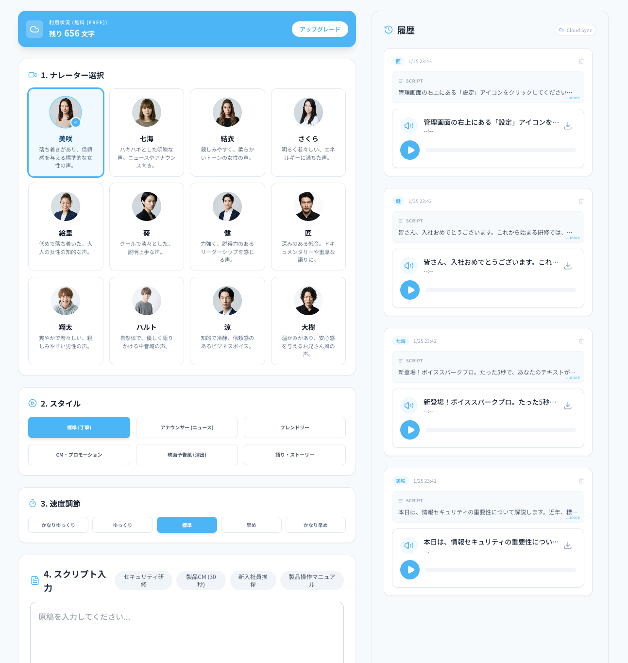 数千文字の原稿も数秒で音声化。ブラウザ上でテキストを修正するだけで即座に音声を更新できるため、急な原稿変更にもノータイムで対応可能です。