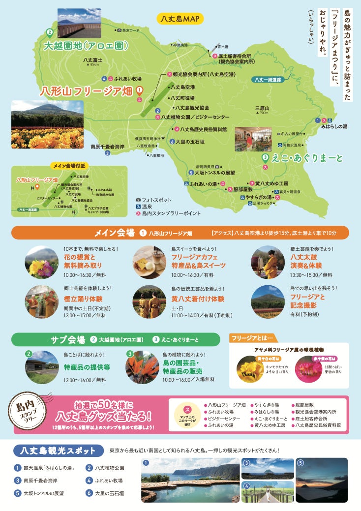 期間中は、フリージアの鑑賞に加え、島の文化を「見て・食べて・体験する」さまざまなイベントを実施。さらに、抽選で50名様に八丈島グッズが当たるスタンプラリーの同時開催も決定しています。