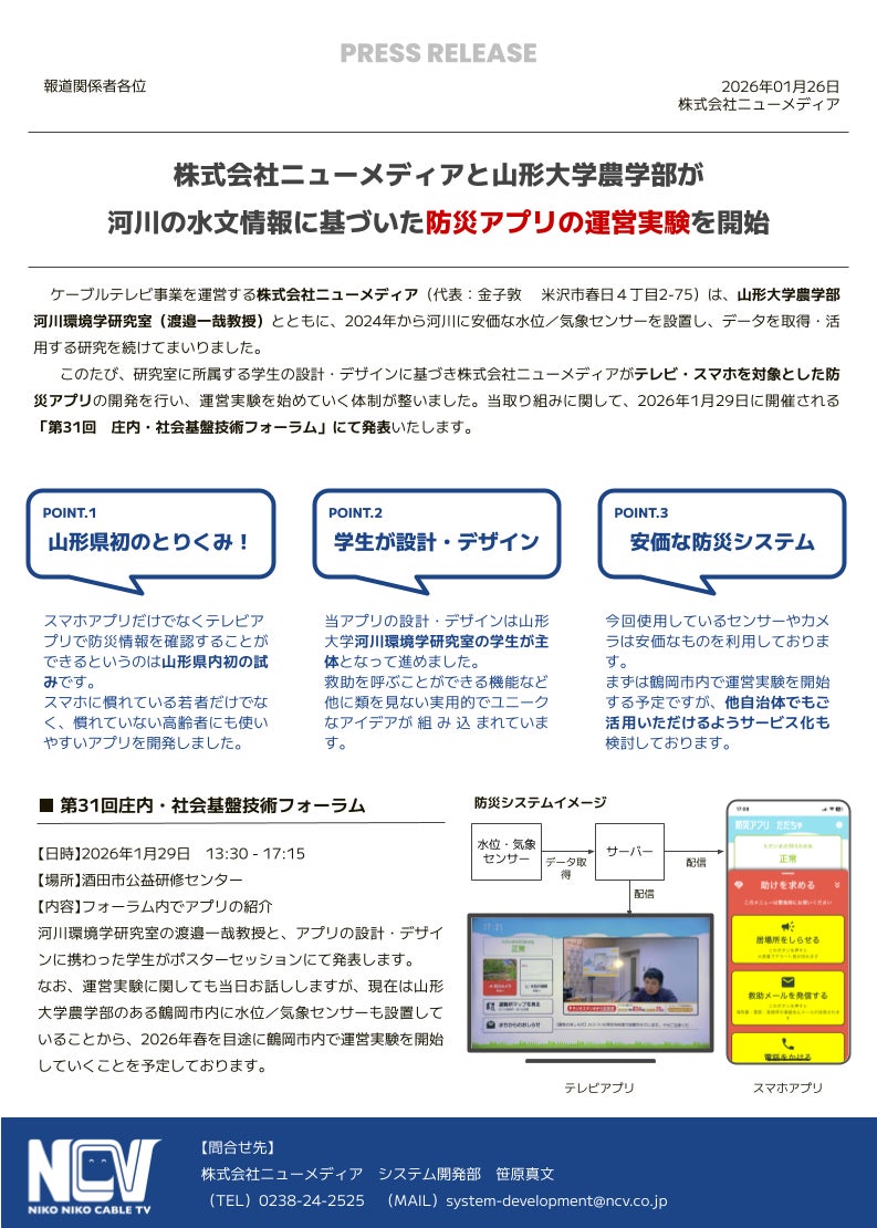 このたび、研究室に所属する学生の設計・デザインに基づき株式会社ニューメディアがテレビ・スマホを対象とした防災アプリの開発を行い、運営実験を始めていく体制が整いました。当取り組みに関して、2026年1月29日に開催される「第31回 庄内・社会基盤技術フォーラム」にて発表いたします。