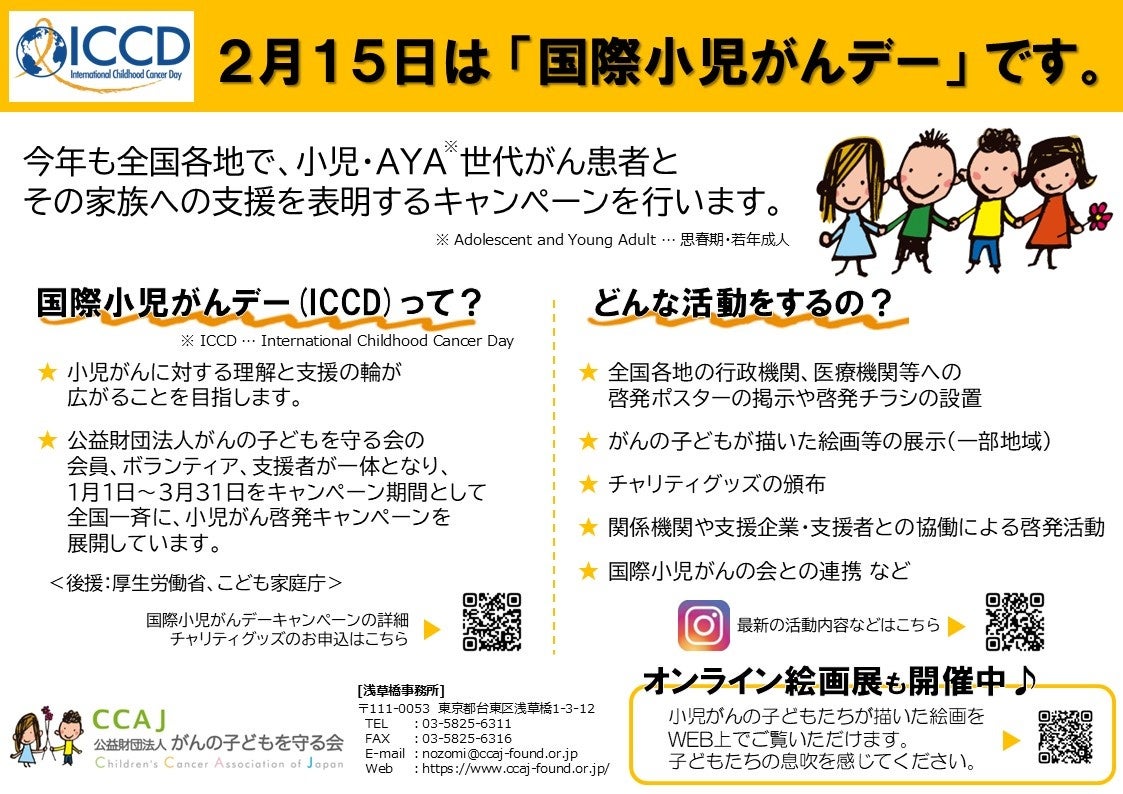 公益財団法人がんの子どもを守る会は「国際小児がんデー」にあわせて、3月末まで小児がん支援のための啓発・チャリティ活動を全国各地で実施いたします(後援:厚生労働省、こども家庭庁)。