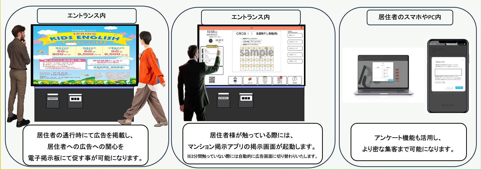 マンションのエントランスは、居住者が必ず通る「生活動線」に位置し、高い接触率が見込まれる場です。