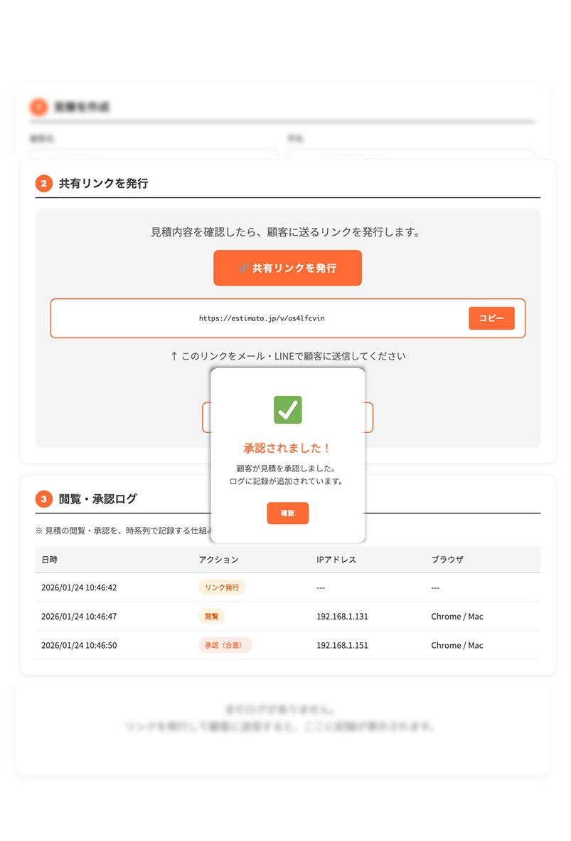 合意ログ: 「見ました」「OKです」を自動記録。お互いの確認が残る安心(おまもり機能)。