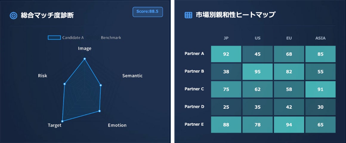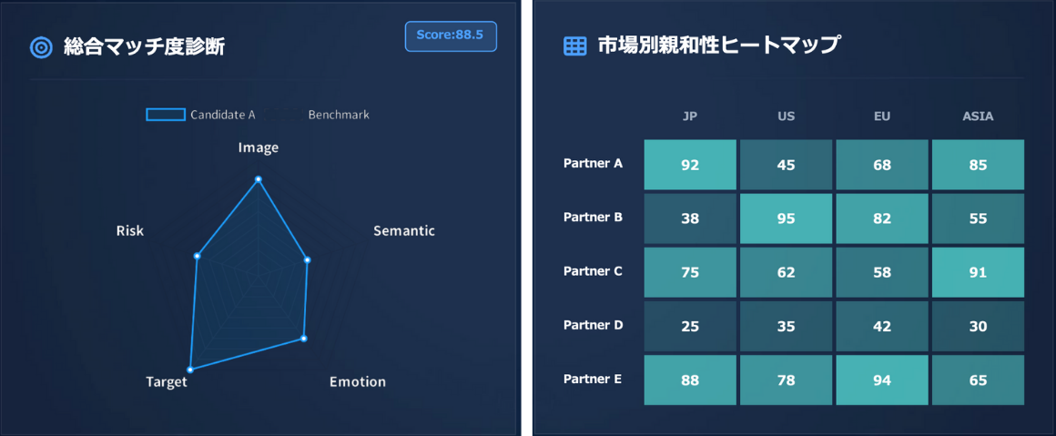 本サービスの指標(世界観・価値観・感情トーンなど)は、国や地域をまたいで比較できる共通の物差しとして設計されています。同じブランドとパートナーの組み合わせであっても、「どの国で相性が良いか」を同一基準で評価できるため、グローバル戦略における市場の優先順位検討にも活用可能です。