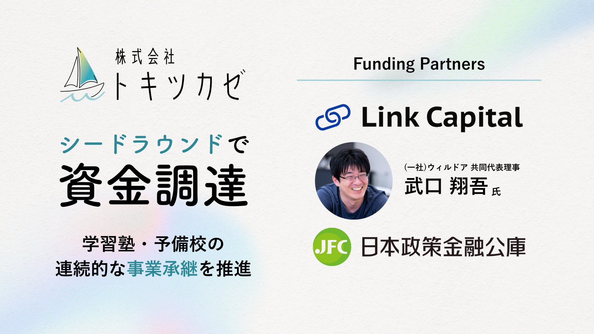 民間教育業界に特化した事業承継に取り組むスタートアップ株式会社トキツカゼ(本社:東京都板橋区、代表取締役CEO:谷津凜勇)は、学習塾・予備校の連続承継と成長を目的として、Link Capital(本社:東京都港区、代表パートナー:青野佑樹)および教育領域に知見を有する個人投資家からの出資、ならびに日本政策金融公庫からの融資により、シードラウンドでの資金調達を実施したことをお知らせいたします。
