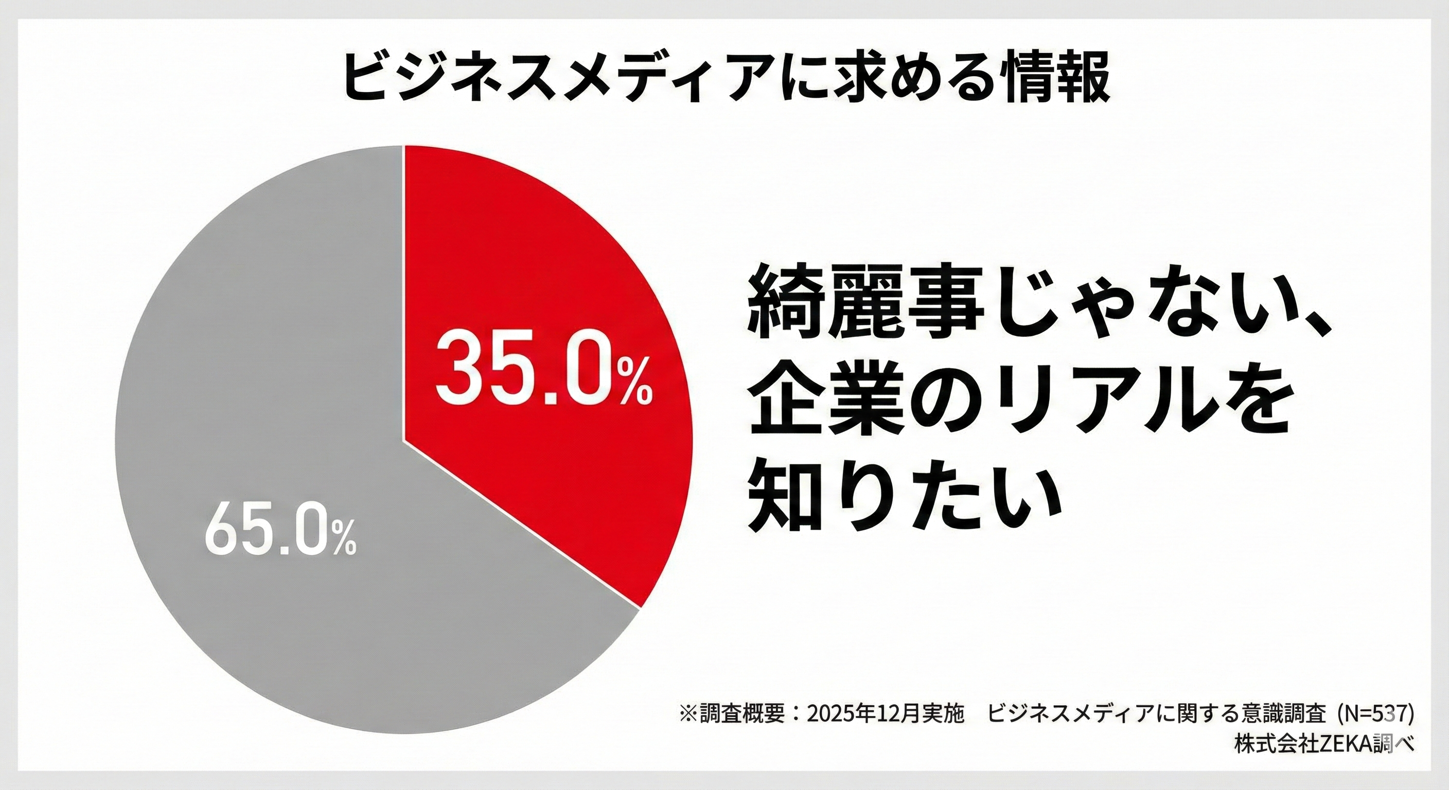 昨今のビジネスメディアは、創業者や代表による華々しい成功ストーリーで溢れています。しかし、当社が実施したビジネスパーソン537名を対象とした意識調査では、「綺麗事じゃない、企業のリアルを知りたい」という回答が35.0%に達しました。*²。