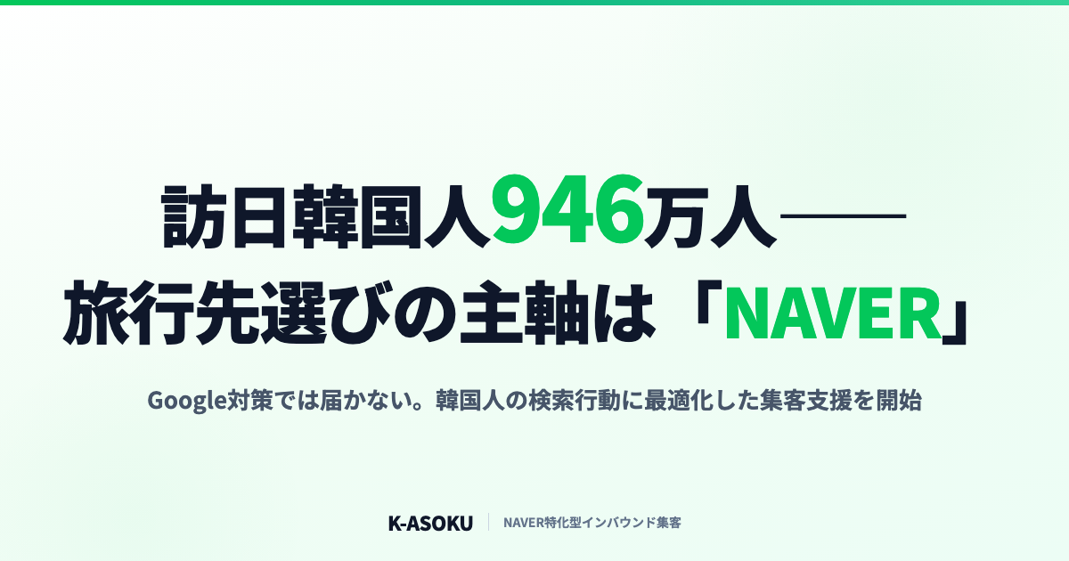 株式会社K-ASOKU(本社:東京都世田谷区、代表取締役:山口雄貴)は、韓国最大の検索プラットフォーム「NAVER」のSEO対策に特化したインバウンド集客サービスを正式にリリースいたしました。飲食店・宿泊施設・美容サロン・観光施設など、韓国人観光客の来店促進を課題とする事業者を対象に、NAVERで検索した韓国人観光客を実際に店舗へ呼び込むまでを一貫して支援いたします。