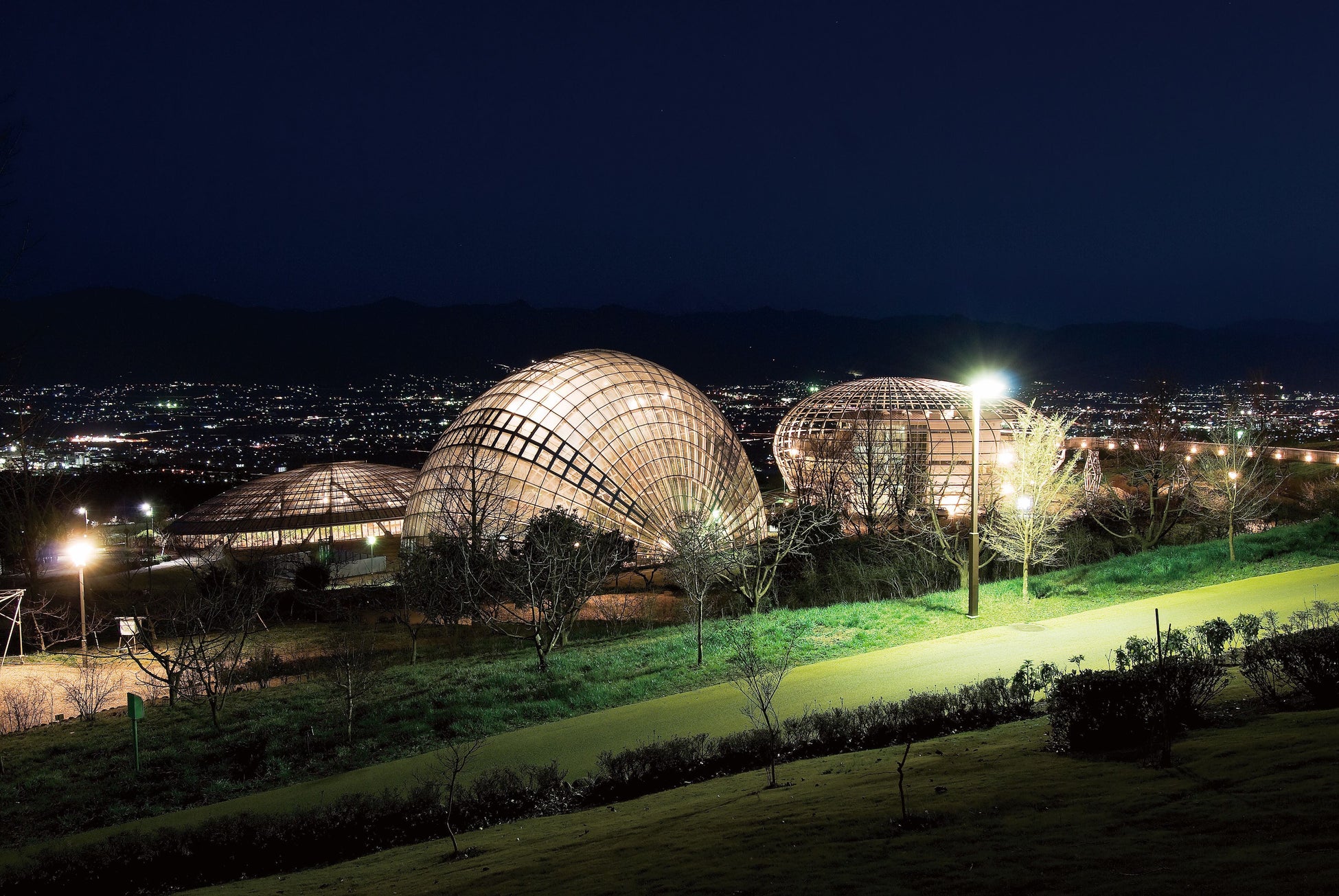 四季折々のフルーツが楽しめる山梨県の峡東地域に位置する笛吹川フルーツ公園は「花とフルーツとワインの公園」をテーマとして整備された都市公園です。約32haの広大な敷地内にはくだものの種子を表現した複数のドームが点在し、存在感を放っています。