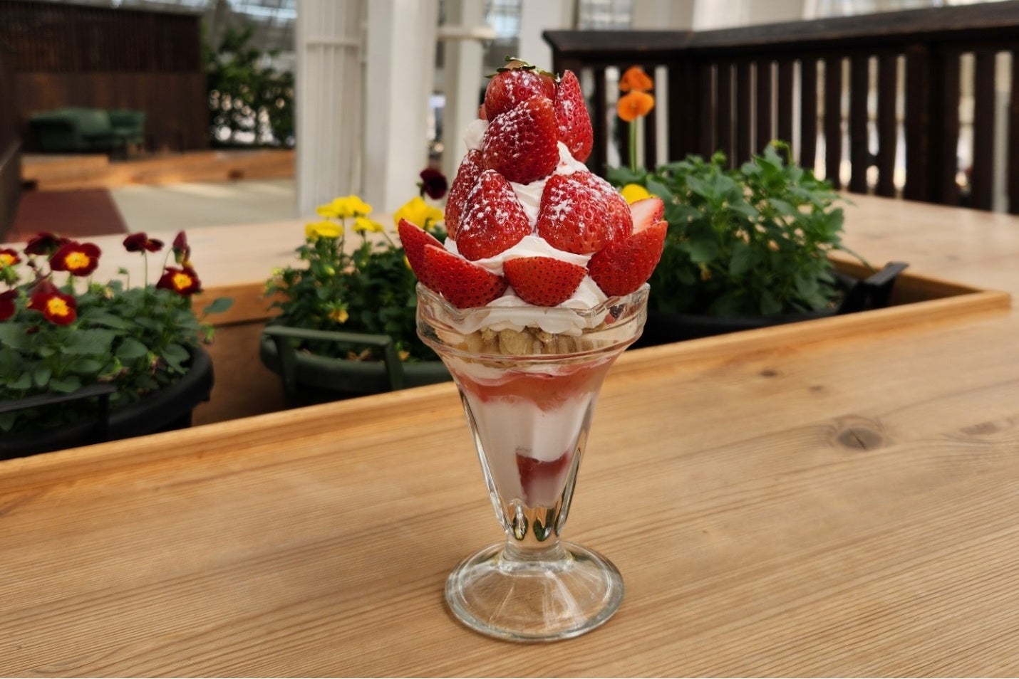 くだもの広場のドーム内にあるカフェでは、山梨名産のブドウ・ナシ・モモ・カキ・クリ・リンゴ・ザクロ・クルミの甲州八珍果を使用した食事やスイーツが楽しめます。