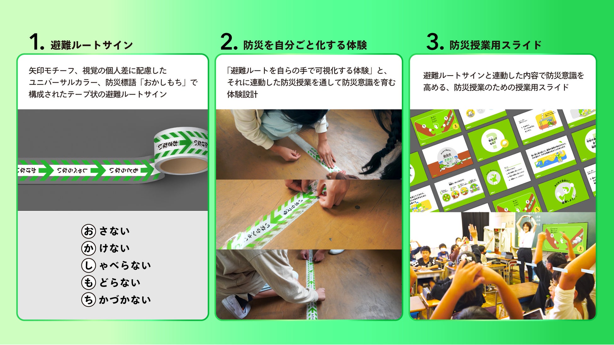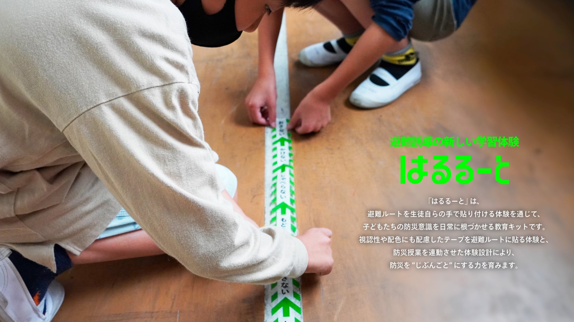 「はるるーと」は、避難ルートに自らの手でテープを貼る体験を通じて、子どもたちの防災意識を日常に根づかせる教育教材です。視認性や配色にも配慮したテープを使った体験と、防災授業を連動させることで、防災を"じぶんごと"にする力を育みます。