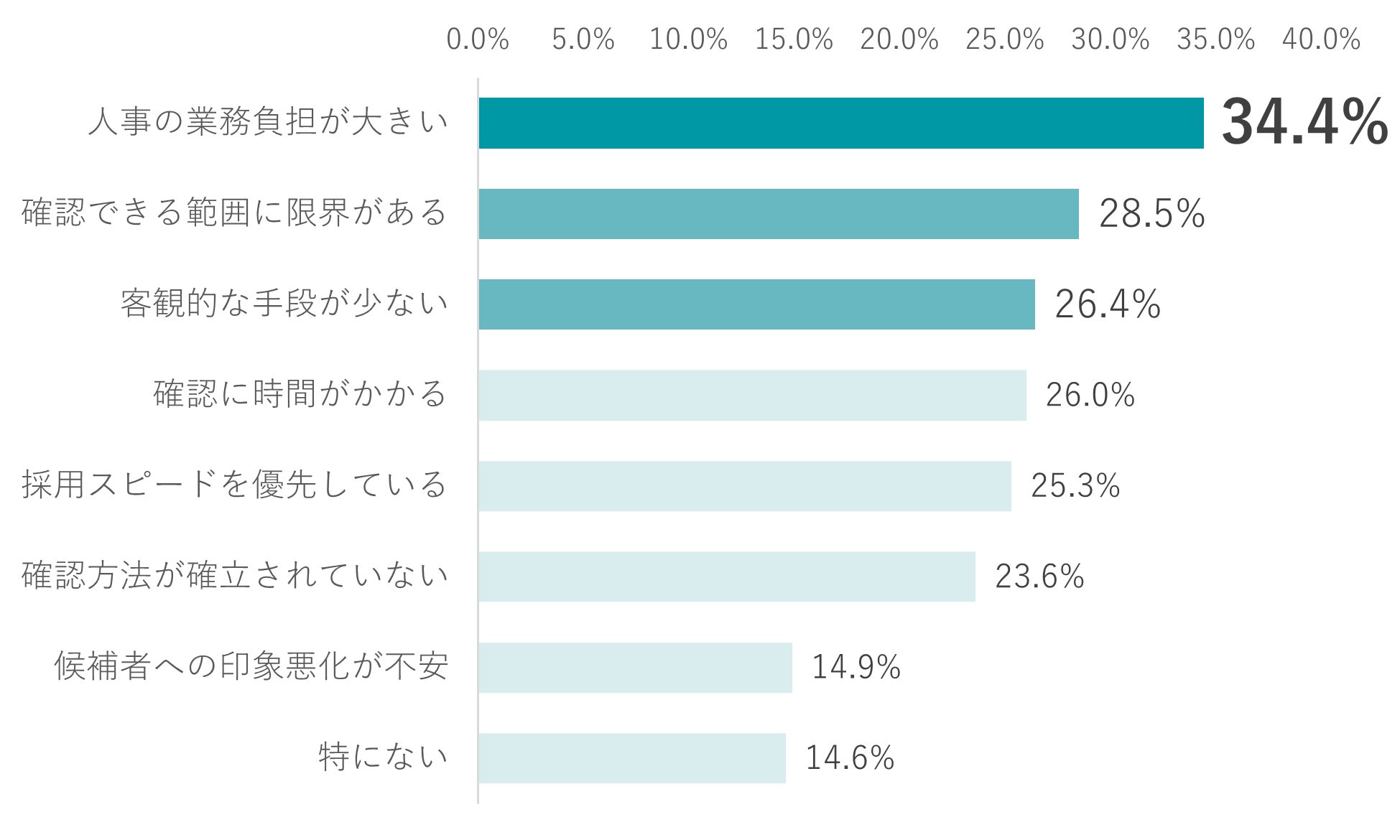 採用選考において、採用判断の検証や裏付けを十分に行えなかった理由について調査したところ、最多回答は「人事の業務負担が大きい(34.4%)」、次いで「確認できる範囲に限界がある(28.5%)」、「客観的な手段が少ない(26.4%)」と続きました。採用判断の精度を高める必要性を認識しながらも、時間や手段の制約によって十分な検証が行えない実態が浮き彫りになりました。