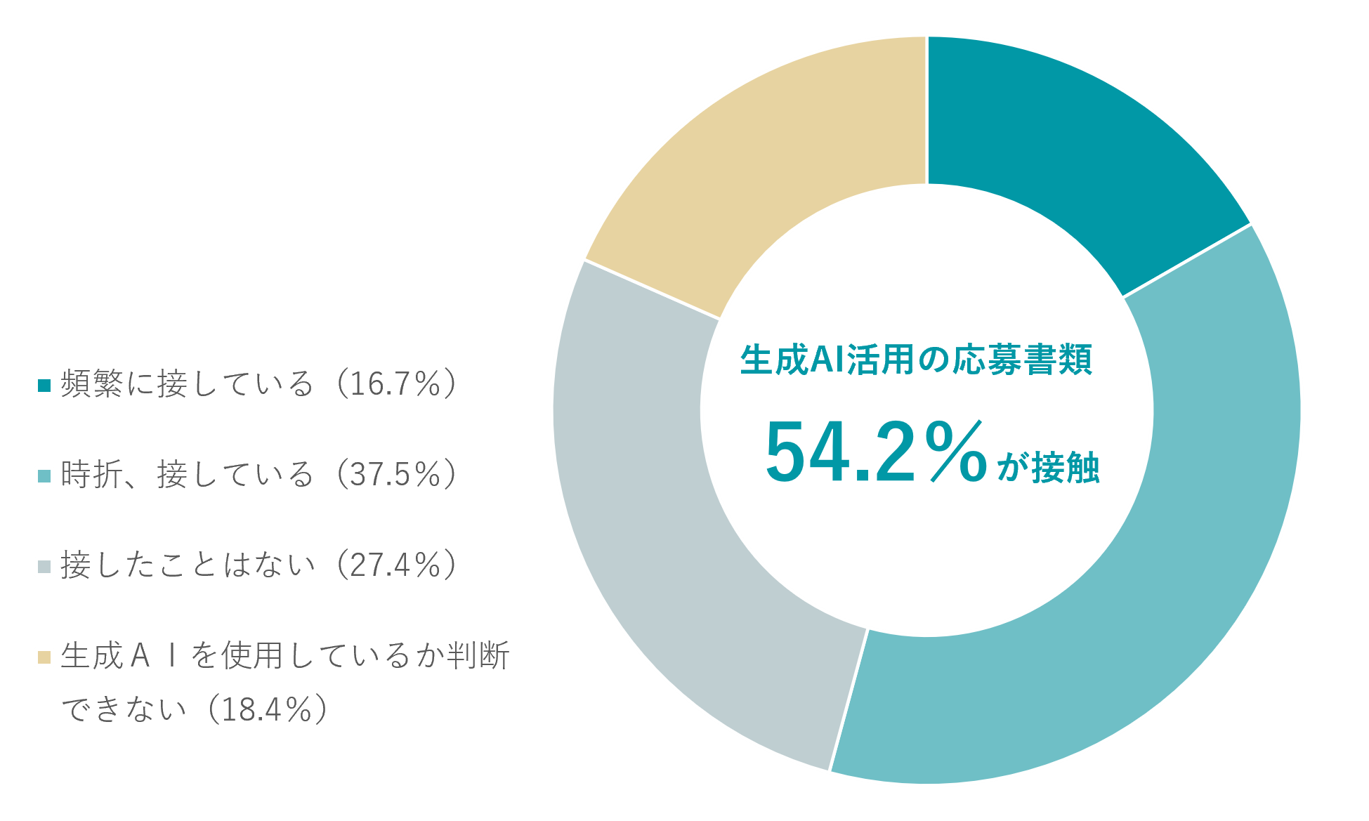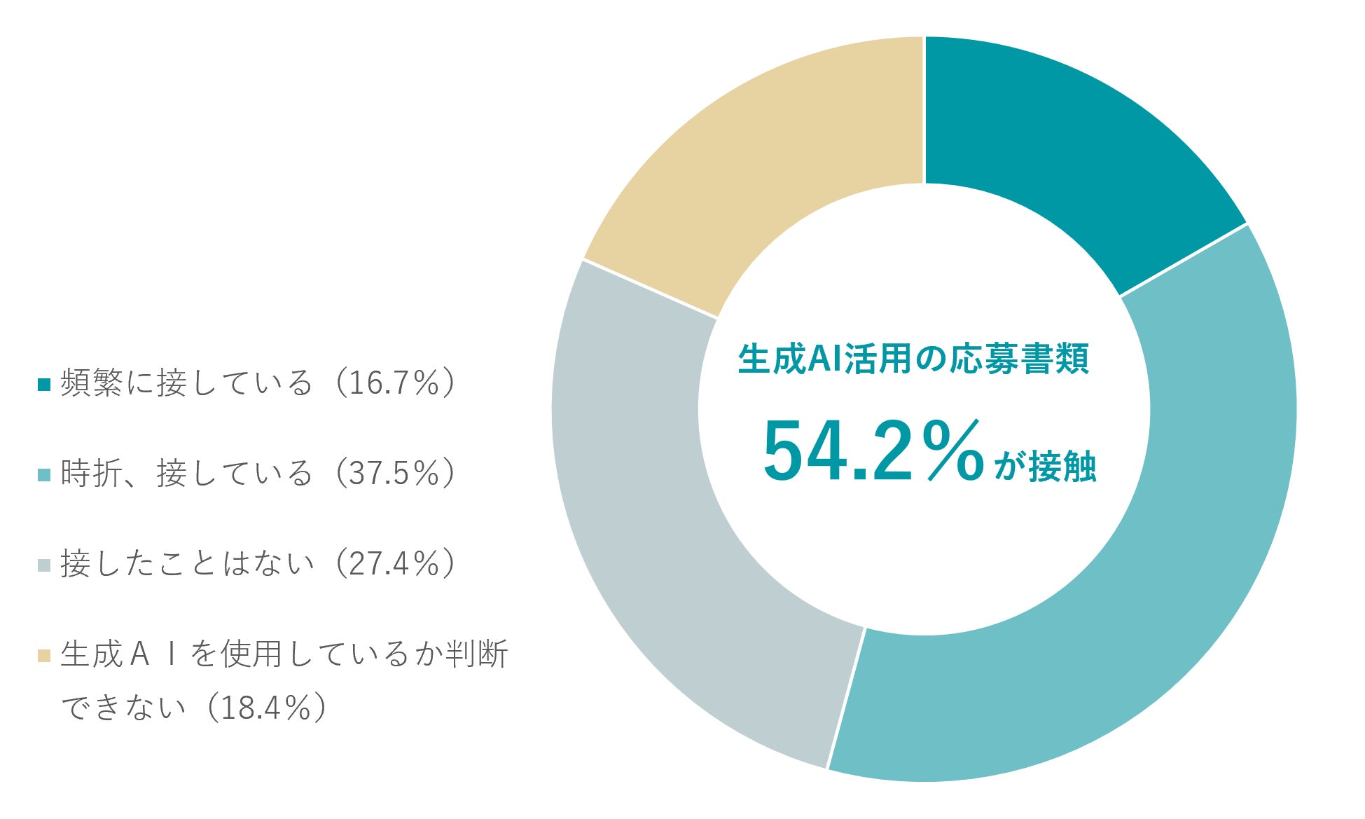 採用選考において、応募者が生成AIを使用したと思われる書類や回答に接したことがあるか調査したところ、54.2%が「接している」(頻繁に接している:16.7%、時折、接している:37.5%)と回答しました。 生成AIの活用が社会全体で広がる中、採用の現場においても、応募書類や選考過程で生成AIを用いたとみられる表現や回答に接する機会が、すでに過半数の企業で発生している実態が明らかになりました。