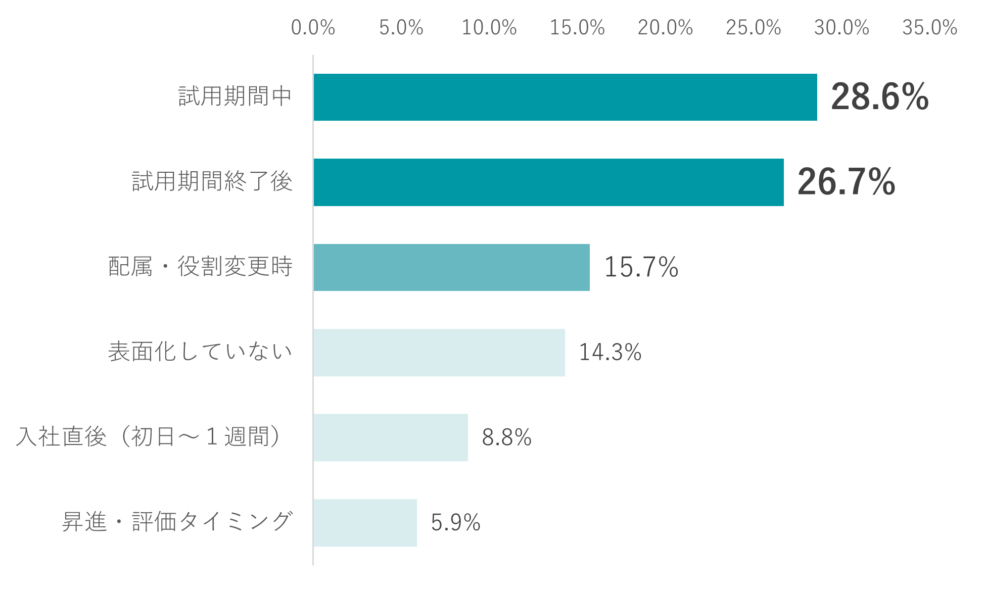 採用ミスマッチが表面化するタイミングについて調査したところ、最多回答は「試用期間中(28.6%)」、次いで「試用期間終了後(26.7%)」、「配属・役割変更時(15.7%)」と続きました。この結果から、採用時の判断と実際の就業実態との間にギャップが生じ、試用期間中という比較的早い段階でミスマッチが顕在化している企業が多いことが分かりました。