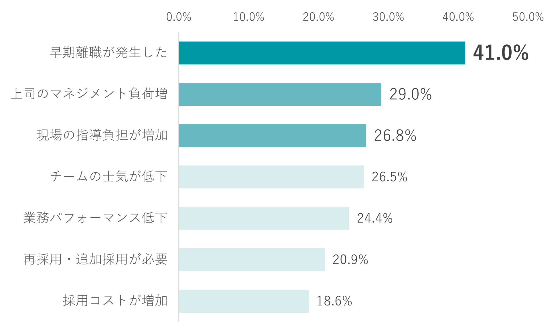 採用ミスマッチによって、実際に発生した影響について調査したところ、最多回答は「早期離職が発生した(41.0%)」、次いで「上司のマネジメント負荷増(29.0%)」、「現場の指導負担が増加(26.8%)」と続きました。採用時の見極め不足が、離職だけでなく現場全体の負荷増加につながっている実態が明らかになりました。