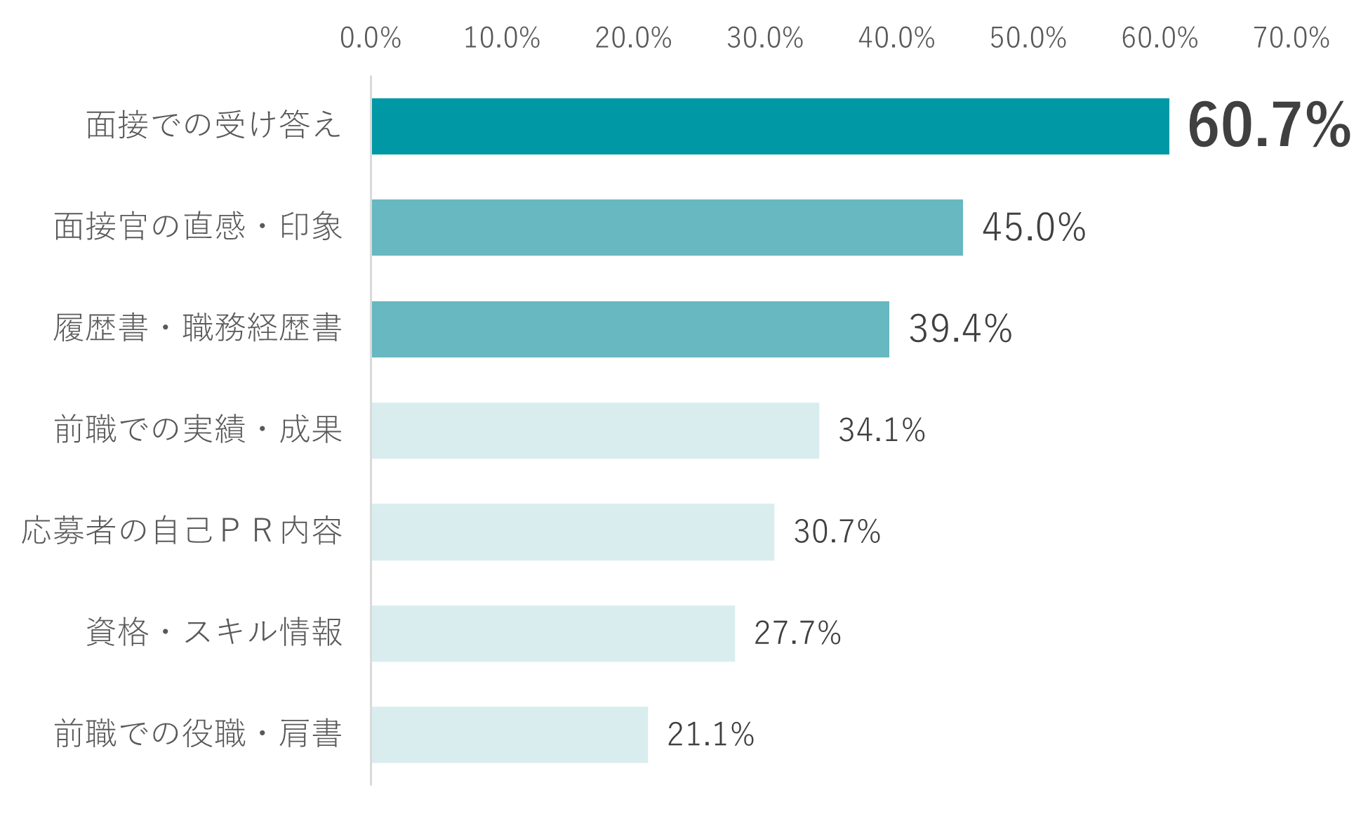 現在の採用選考において、最終的な採用判断に依存している情報について調査したところ、最多回答は「面接での受け答え(60.7%)」、次いで「面接官の直感・印象(45.0%)」、「履歴書・職務経歴書(39.4%)」と続きました。採用判断が面接時の限られた情報や主観に依存していることが、ミスマッチ発生の一因となっている可能性がうかがえます。