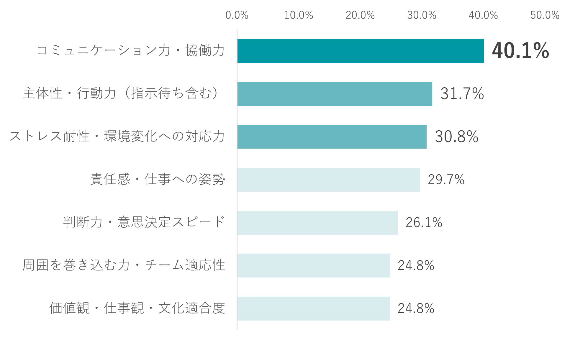 さらに、書類選考や面接といった一般的な採用プロセスでは把握しづらく、入社後にギャップを感じやすい応募者情報について尋ねたところ、最多回答は「コミュニケーション力・協働力(40.1%)」、次いで「主体性・行動力(指示待ち含む)(31.7%)」、「ストレス耐性・環境変化への対応力(30.8%)」と続きました。