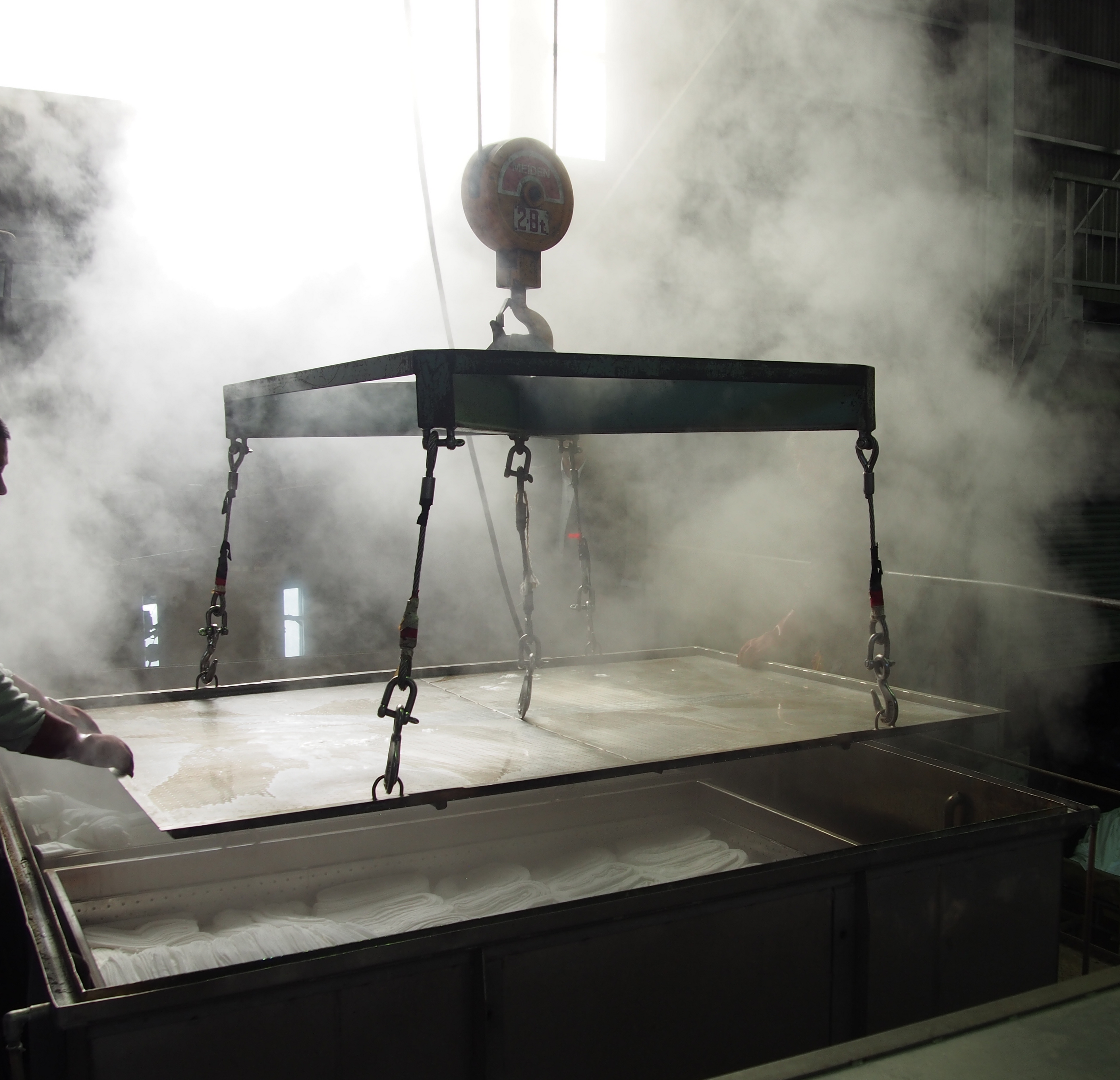 和晒は、生地を釡でじっくり焚き上げ乾燥させることで木綿本来の風合いを引き出す堺の伝統産業。和晒ならではの毛羽立ちにより吸水性や通気性に優れ、柔らかい肌触りが特長です。