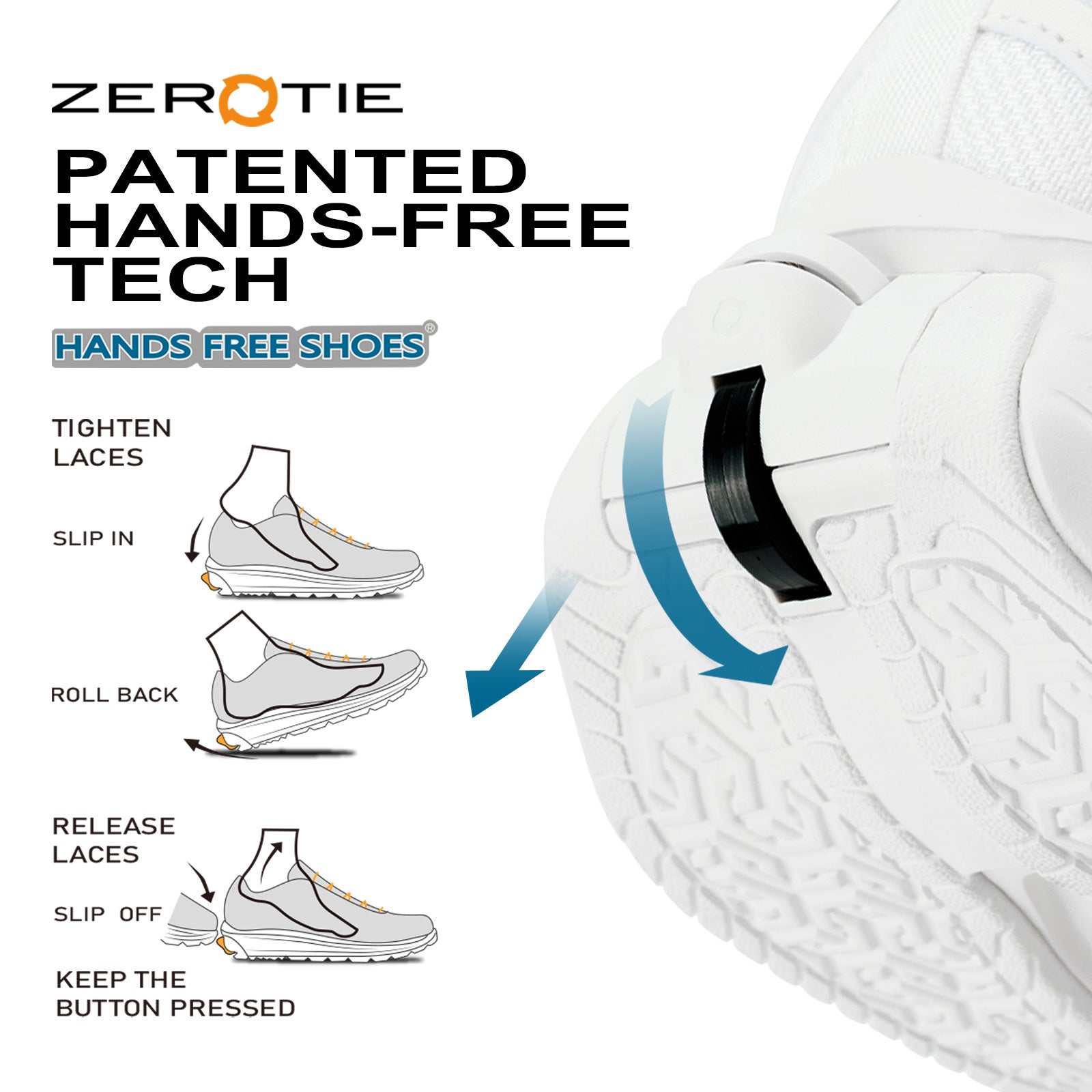 ZeroTieフィットシステム— 特許取得済みの自己完結型メカニズムがヒールにシームレスに統合され、ハンズフリー調整が可能になります。
