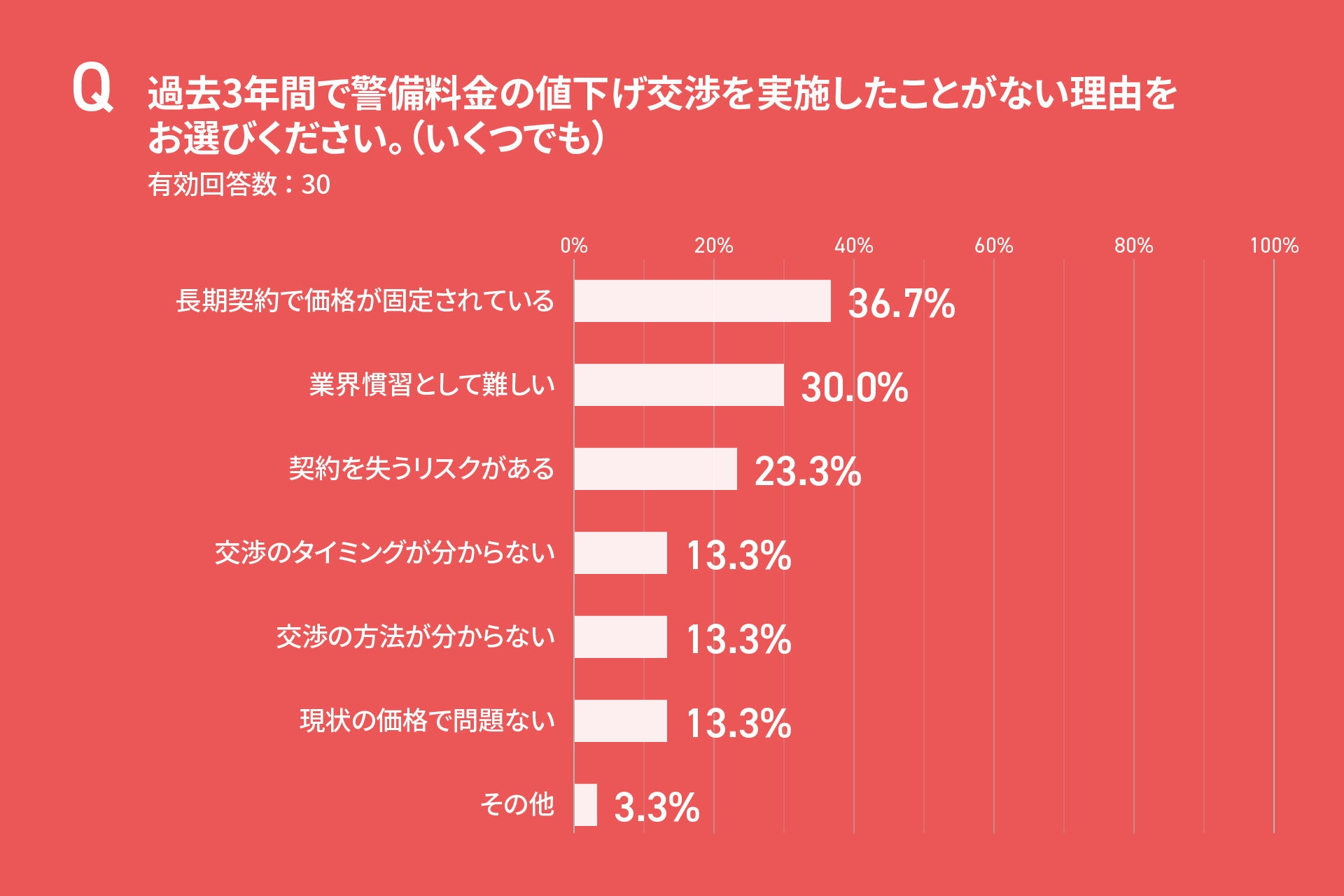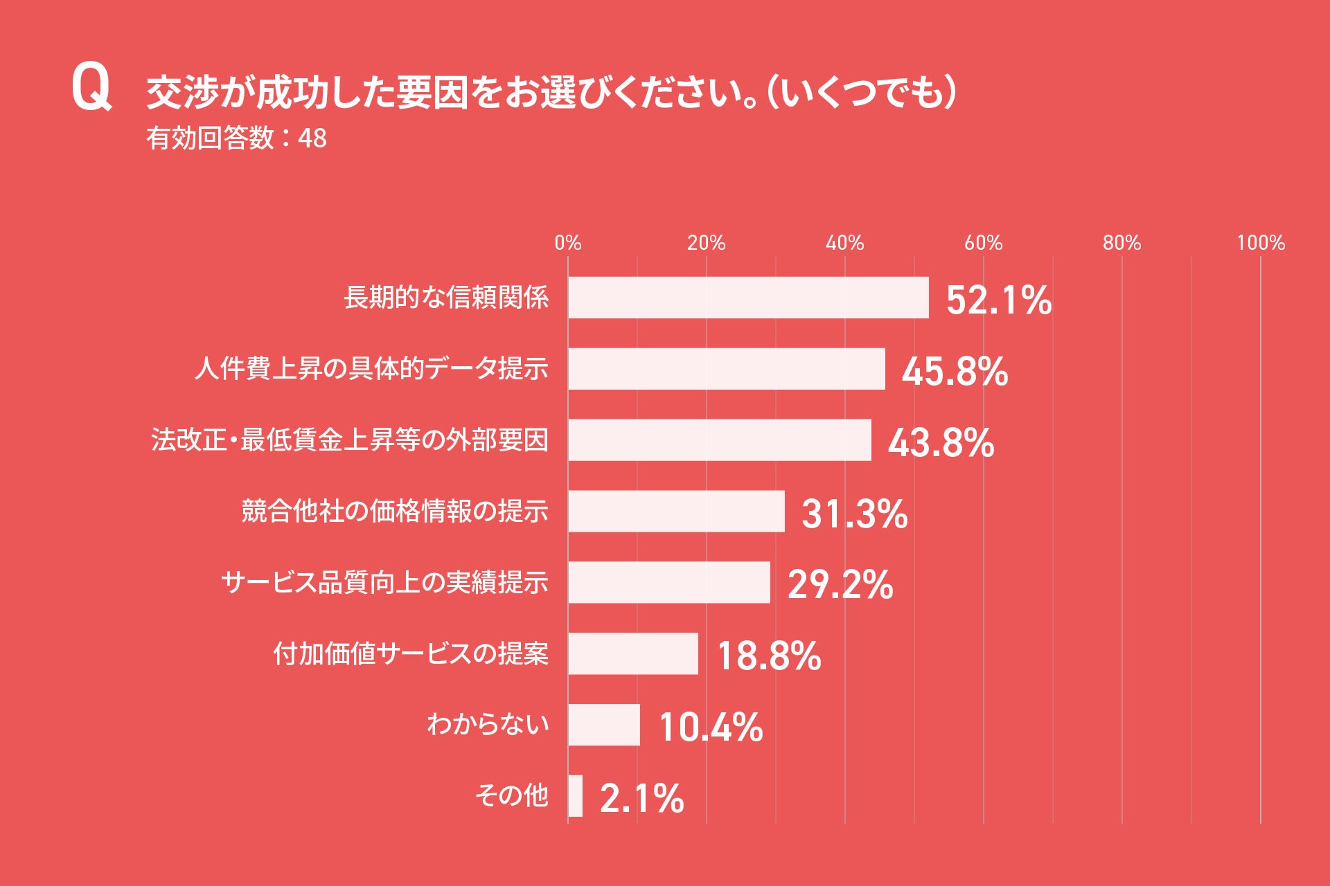 成功要因として挙がったのは、「人件費上昇の具体的データ提示」「サービス品質向上の実績の提示」などがあげられました。最も高い要因であった「長期的な信頼関係」に加え、データと実績に基づく交渉姿勢が効果的であることが示唆されました。