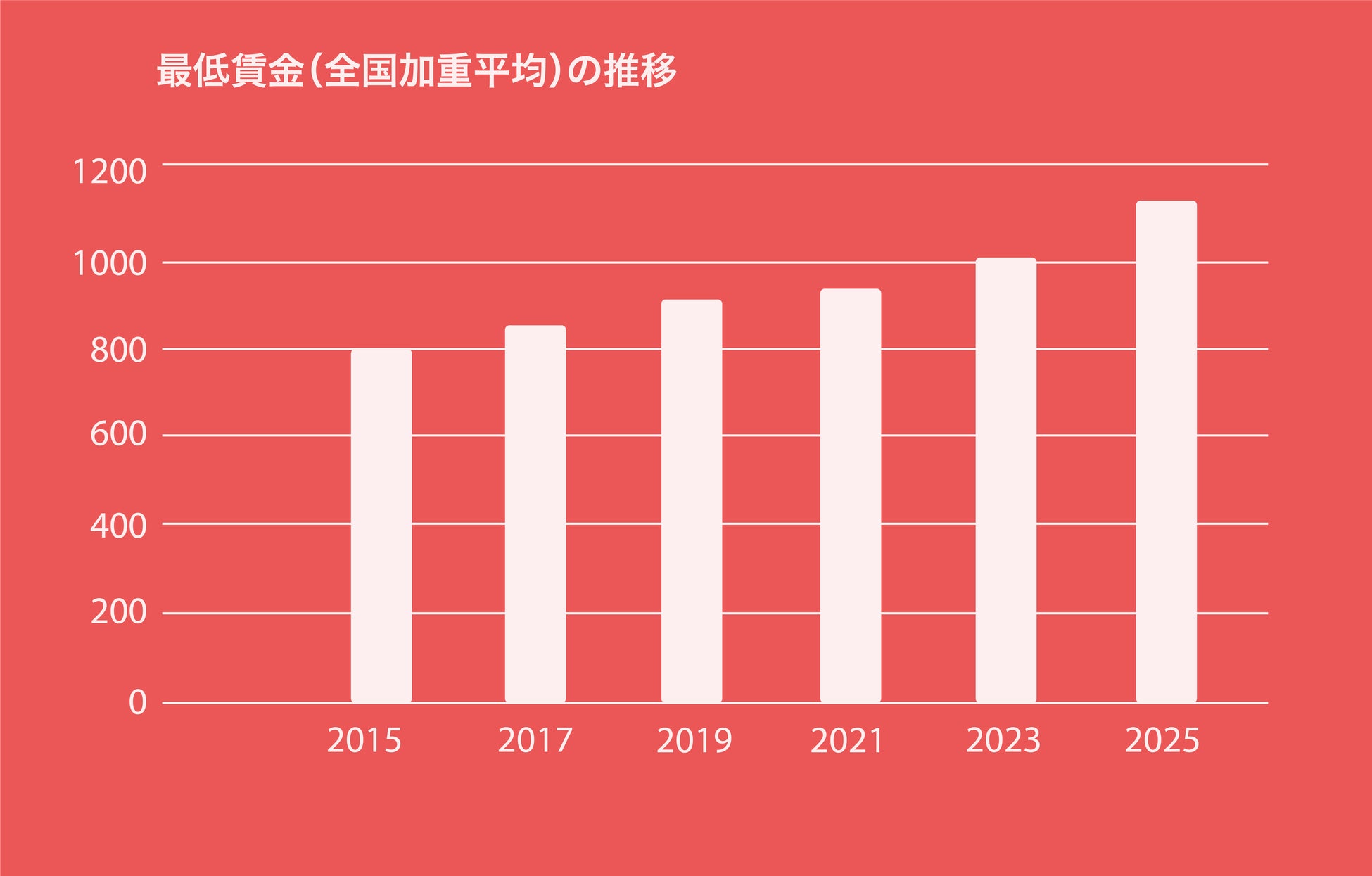 日本の最低賃金は近年大幅な上昇を続けています。全国加重平均は2015年度の798円から上昇を続け、2023年度には1,004円、2024年度には1,055円となりました。さらに令和7年度の最低賃金は全国加重平均1,121円となり、10年間で約40%増加するなど、全国的に人件費負担が増大しています(※1)。