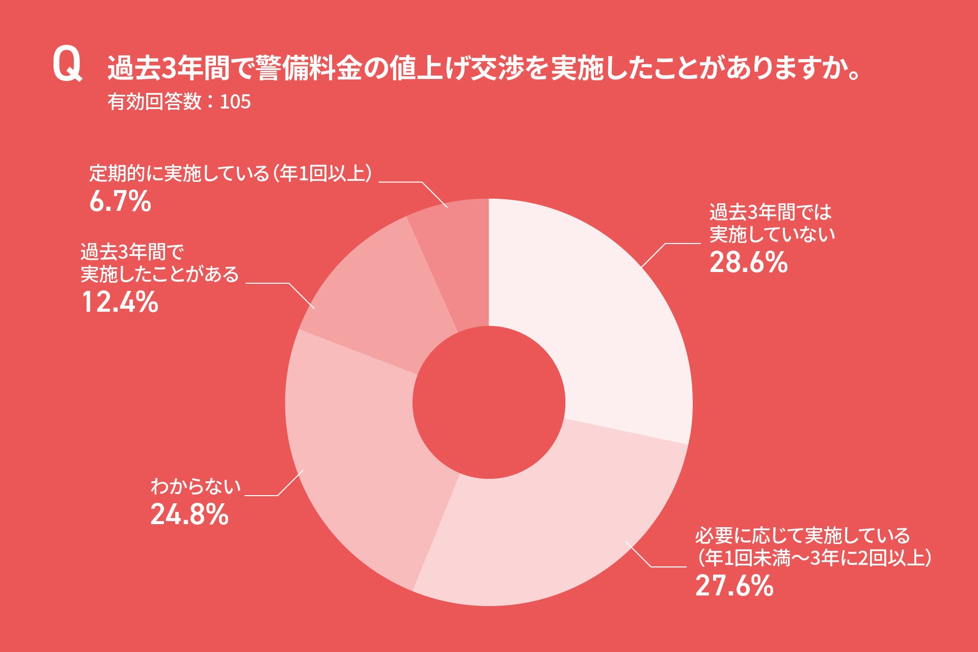 今回の調査から、警備業界は料金水準への不満(40.9%)、賃金交渉の難航(未実施28.6%)、最低賃金の急速な上昇という三つの負荷に同時に直面していることが明らかになりました。交渉しても成功率は安定せず、「半々(40〜60%未満)」が40.8%、「あまり成功しない」が20.4%と、価格改定が計画通りに進みにくい構造があります。