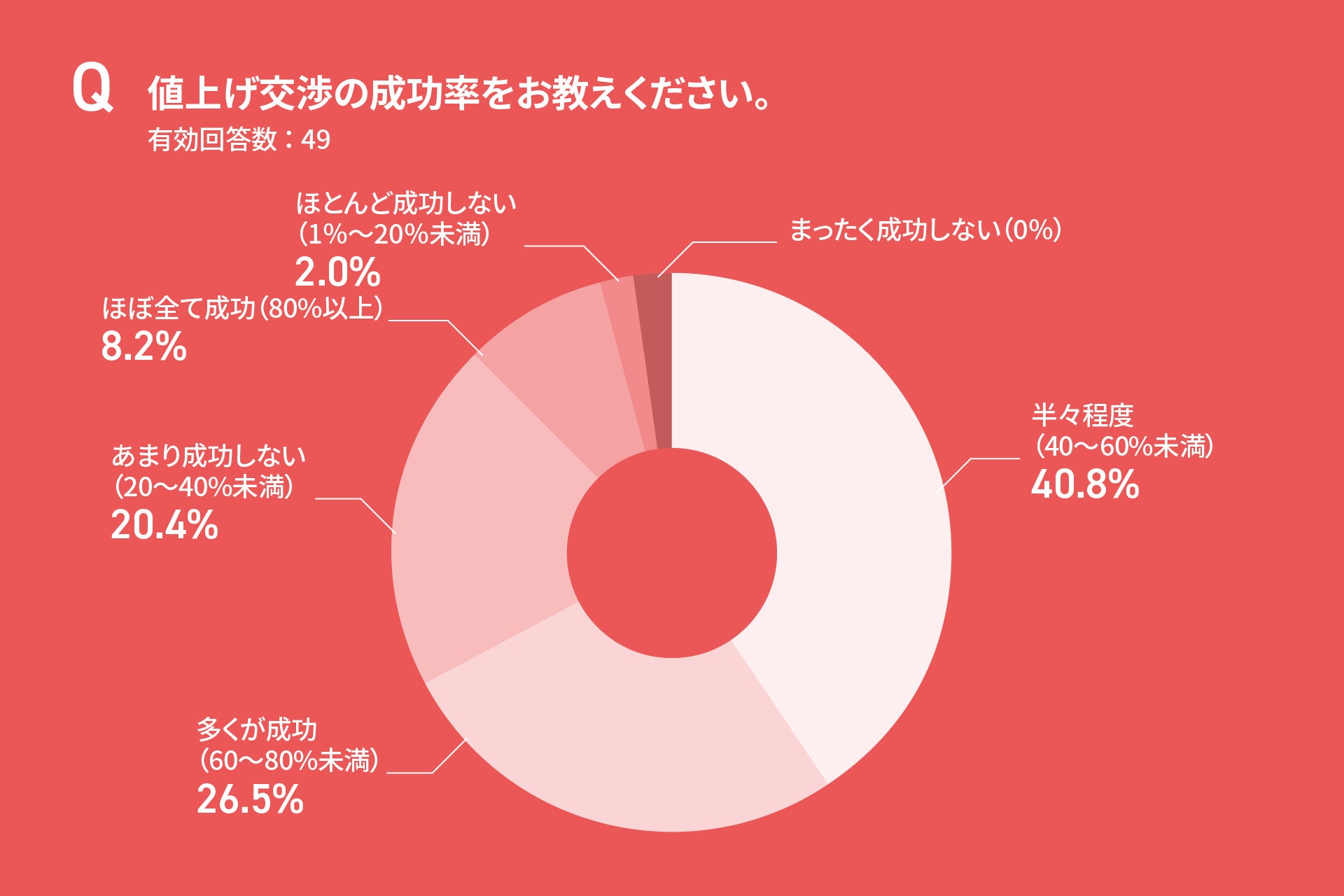 料金交渉は28.6%が未実施。交渉しても成功率は安定せず、「半々」が40.8%、「あまり成功しない」が20.4%と、価格改定が進みにくい構造が続いている。