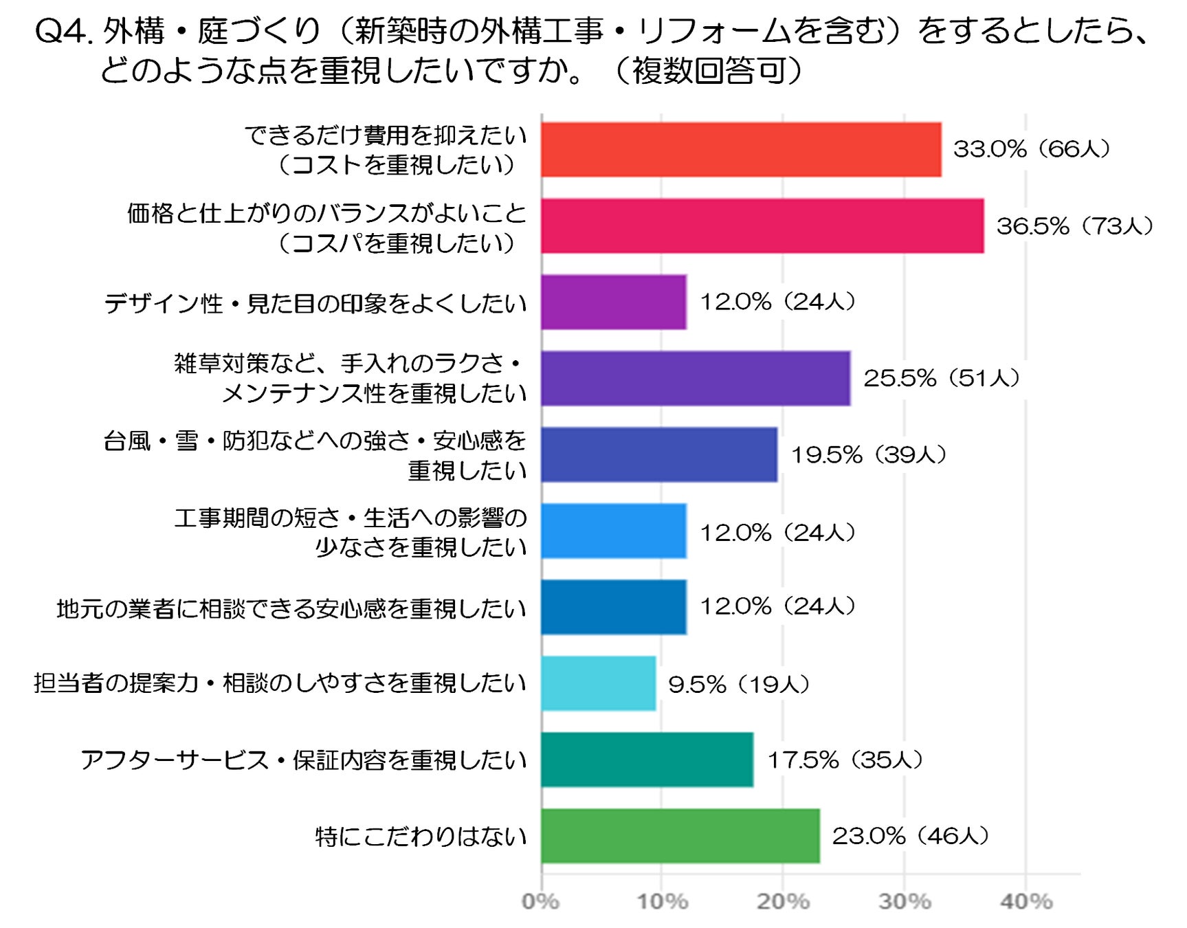 デザイン面では「デザイン性・見た目の印象をよくしたい」12.0%(24人)でした。同じ12.0%(24人)で「工事期間の短さ・生活への影響の少なさを重視したい」「地元の業者に相談できる安心感を重視したい」も並んでおり、見た目の改善だけでなく、工事中の負担の少なさや相談先の安心感を重視する層が一定数いることが分かります。