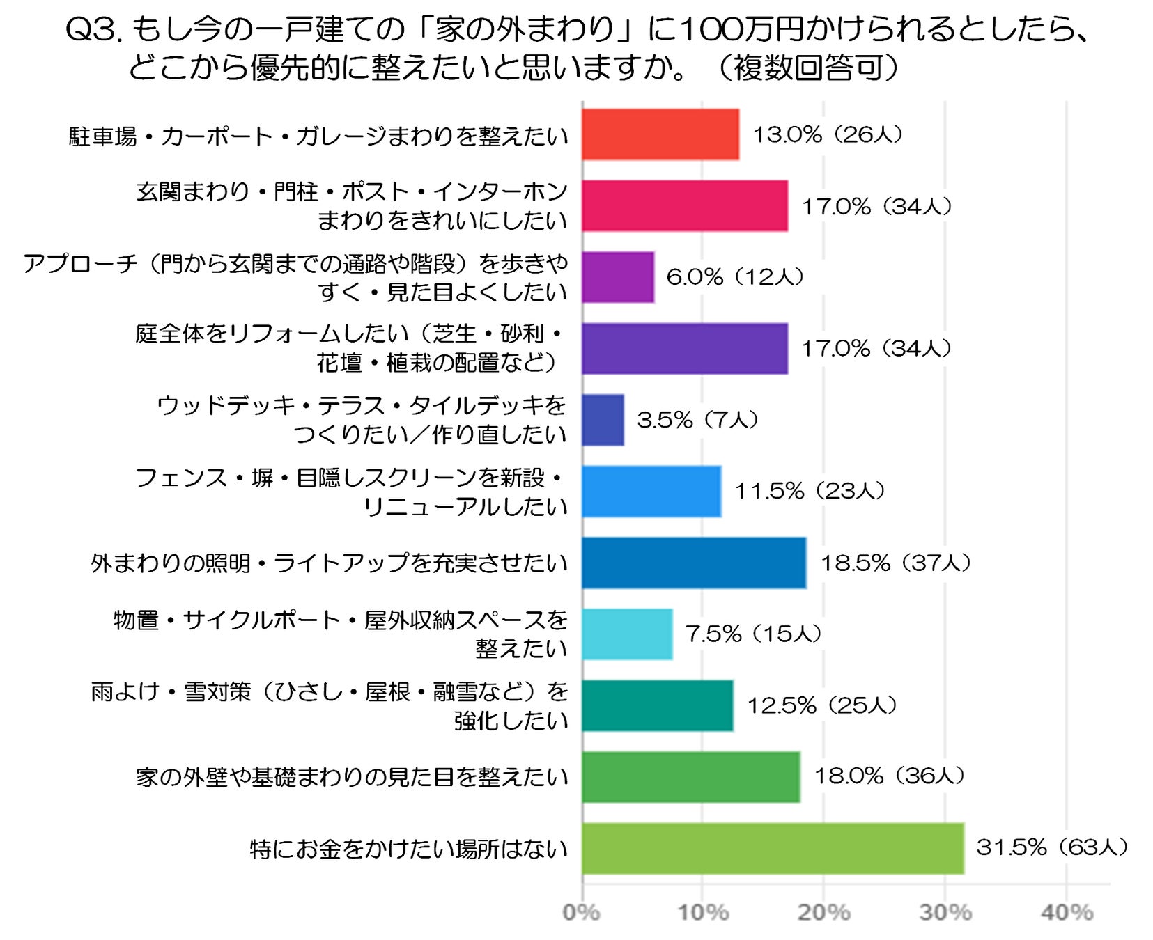 最後に、「特にお金をかけたい場所はない」31.5%(63人)も多く、現状の外まわりに大きな不満がない人も少なくない結果でした。