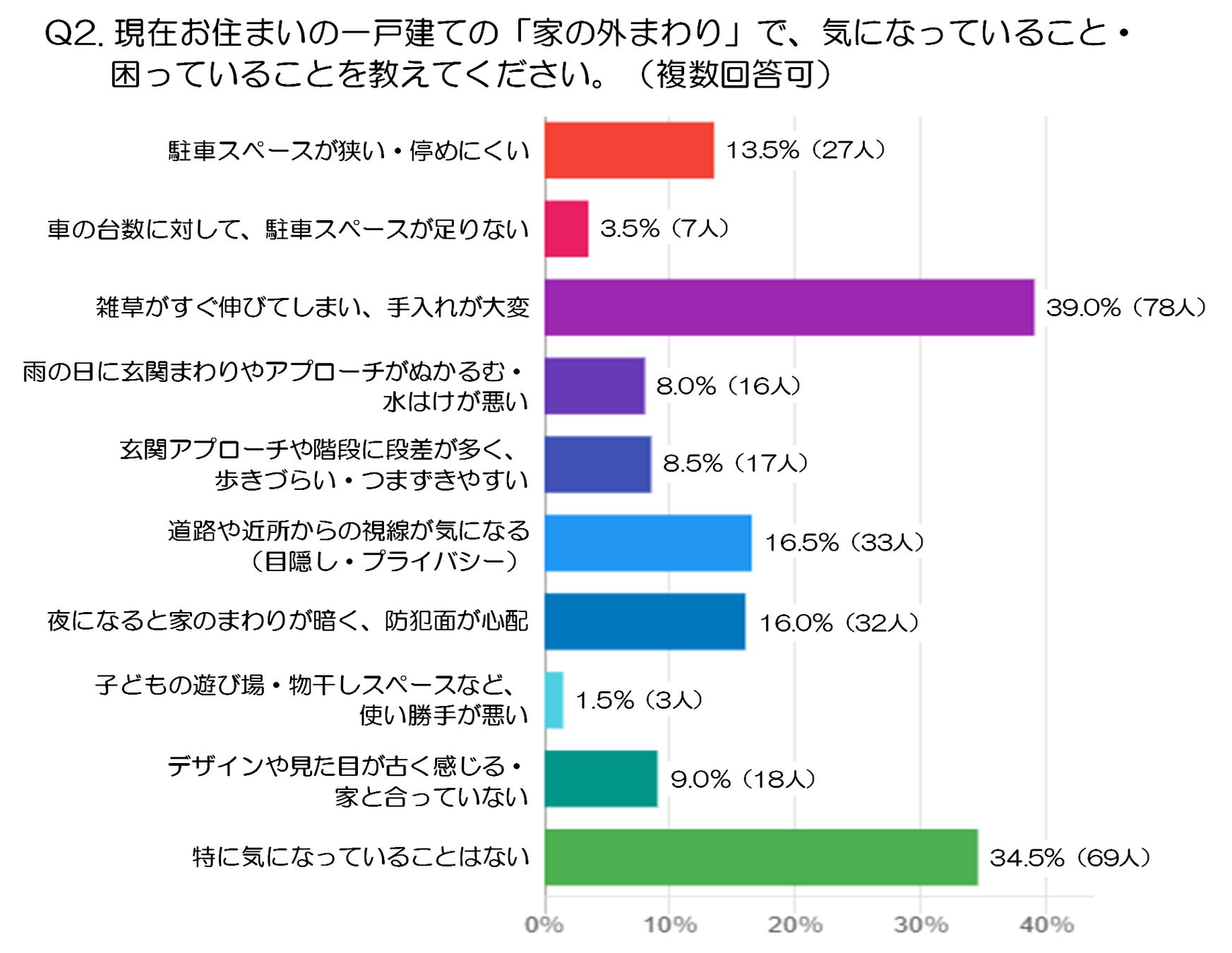 なお、「特に気になっていることはない」34.5%(69人)も多く、現状の外まわりに大きな困りごとを感じていない人も少なくない結果でした。