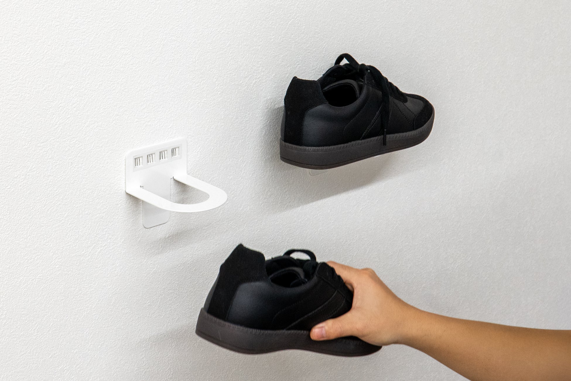 従来のシューズラックやシューズボックスは床に設置するためスペースに限りがありますが、「シューズステップラック」は壁面が石膏ボードであればどこでも自由に設置することができます。