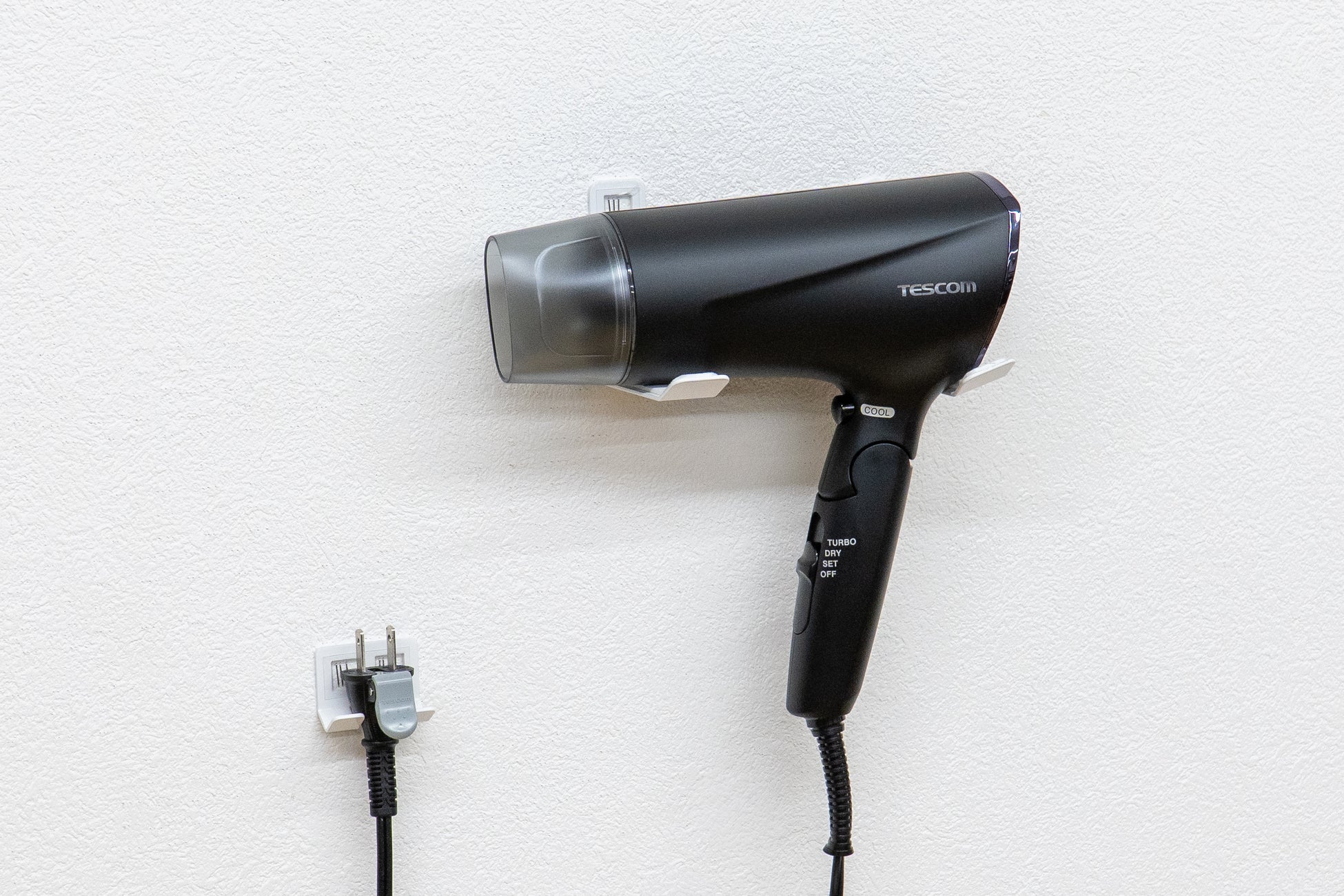 ドライヤーをかけるフック部を2パーツに分けることで、お持ちのドライヤーに合わせて取り付けることができます。そうすることで、対応不可のドライヤーは限りなく少なく、どんな形のドライヤーも水平かつ安定して壁掛けすることができ、見た目もすっきり綺麗に収納できます。