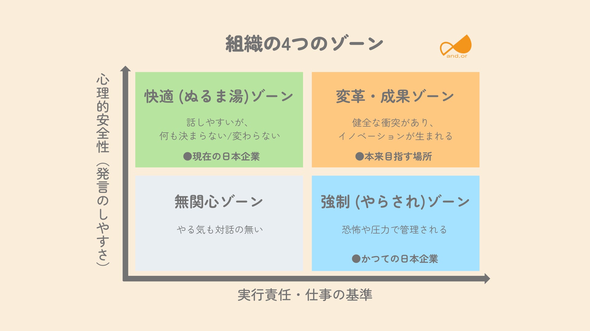 組織行動学(エイミー・エドモンドソン教授ら)の理論において、組織は「心理的安全性(話しやすさ)」と「仕事の基準・責任(実行力)」の2軸で4つのゾーンに分類されます。