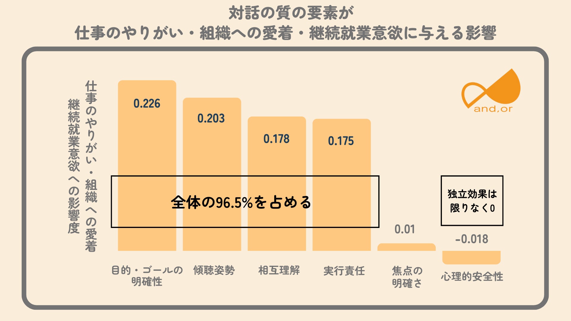 影響度を測る詳細な統計分析の結果、心理的安全性が成果(やりがい・組織への愛着)に与える直接的な影響は「ほぼゼロ」であることが判明しました。