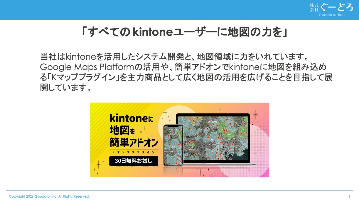 株式会社ぐーどろは、kintoneを活用した業務システム開発・販売を主業とし、特に Google Maps Platform を中心とした地図機能の連携活用に強みを持っています。簡単設定でkintoneにGoogleマップを足すことのできるKマッププラグインも開発販売しております。