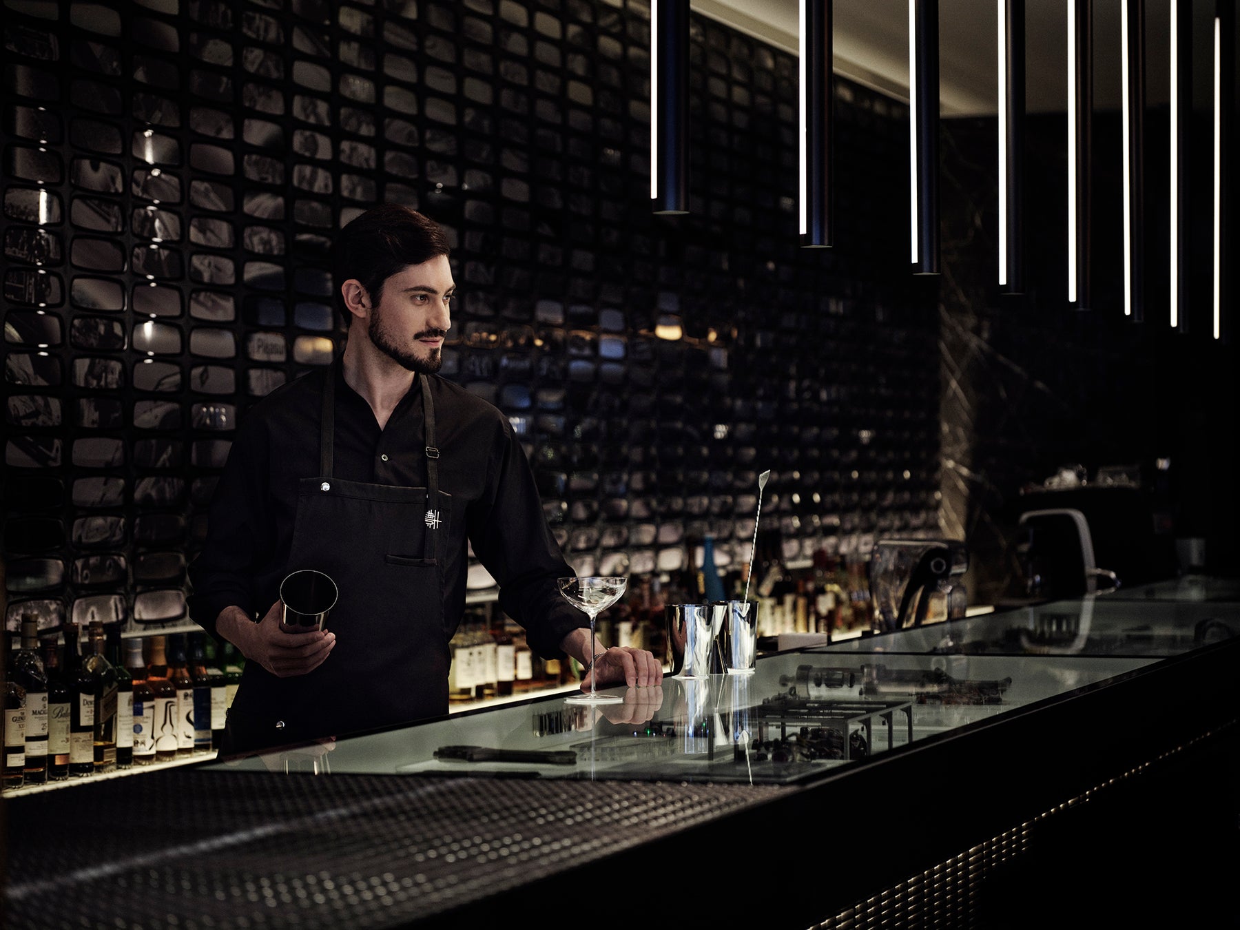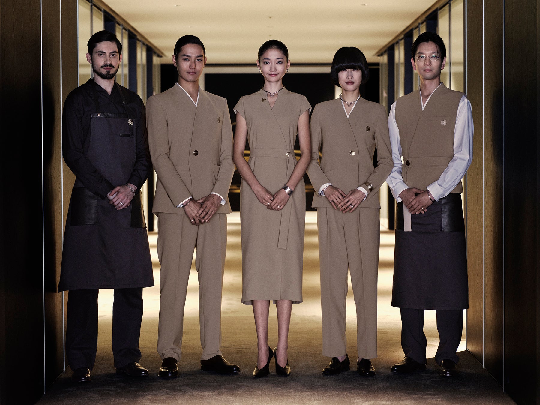 レセプション、フロアスタッフ、バーテンダー、ソムリエなど、それぞれの役割に適したユニフォームを制作するため、ジャケット、ベスト、シャツ、パンツ、ワンピース、ギャルソンエプロン、サロンエプロンのデザインを手掛けました。ユニフォームのカラーは、本施設の空間と調和するトーンを採用。空間に自然と溶け込みながらも、静かな存在感を放つ佇まいを目指しています。