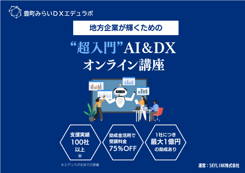 SKYLINK株式会社(東京都品川区)は、Innovation Hub株式会社(東京都港区)と連携し、DX(デジタルトランスフォーメーション)およびAI研修サービス「豊町みらいDXエデュラボ」を開始いたします。まずは自社グループ企業向けに研修を提供し、その成果を基に、より広く地域企業や全国企業に向けてサービスを拡大していく予定です。