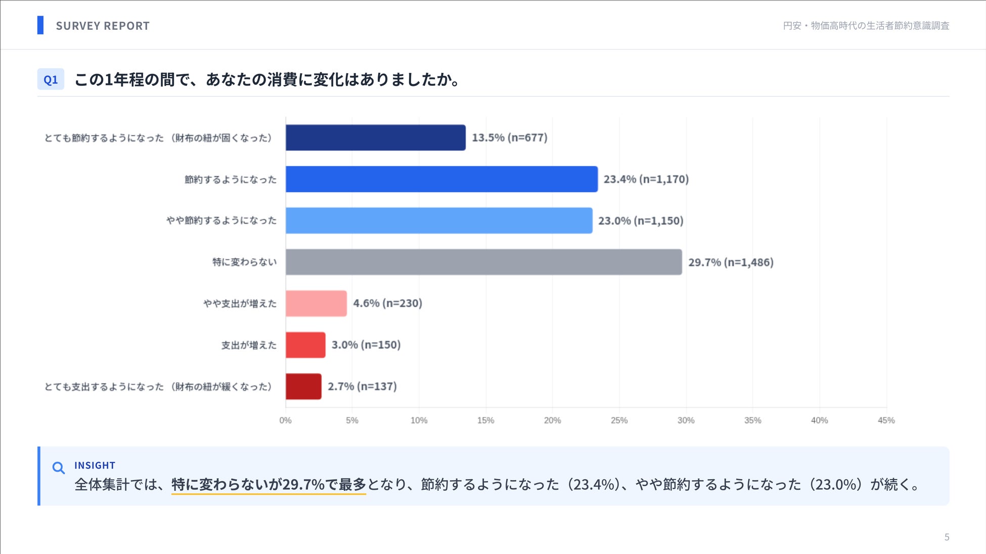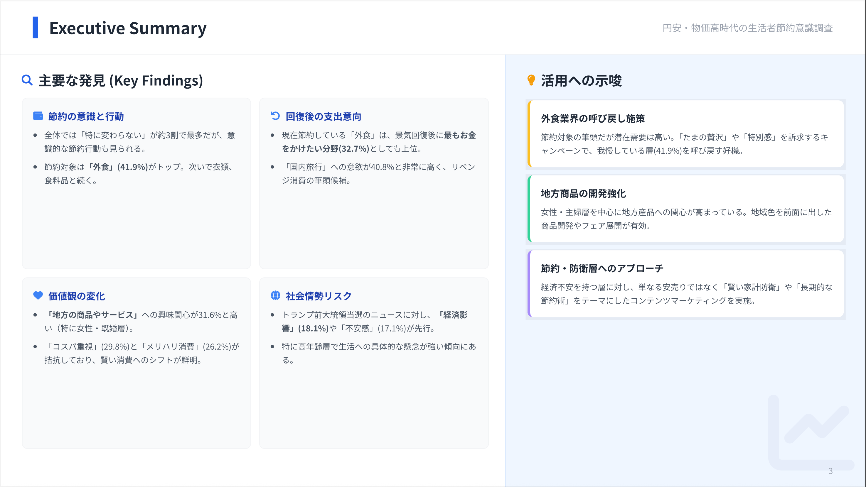 単なる自動集計ではなく、自由回答は代表ラベル付与/ラベル別集計などを行い、重要な指標は、つまり何が言えるのか(So What→ → → )まで整理して提示します。読み手が意思決定に移れる構成(結論 根拠 示唆 打ち手の順など)でまとめ、分析観点の抜け漏れを減らすチェック設計と整形で品質を担保します。