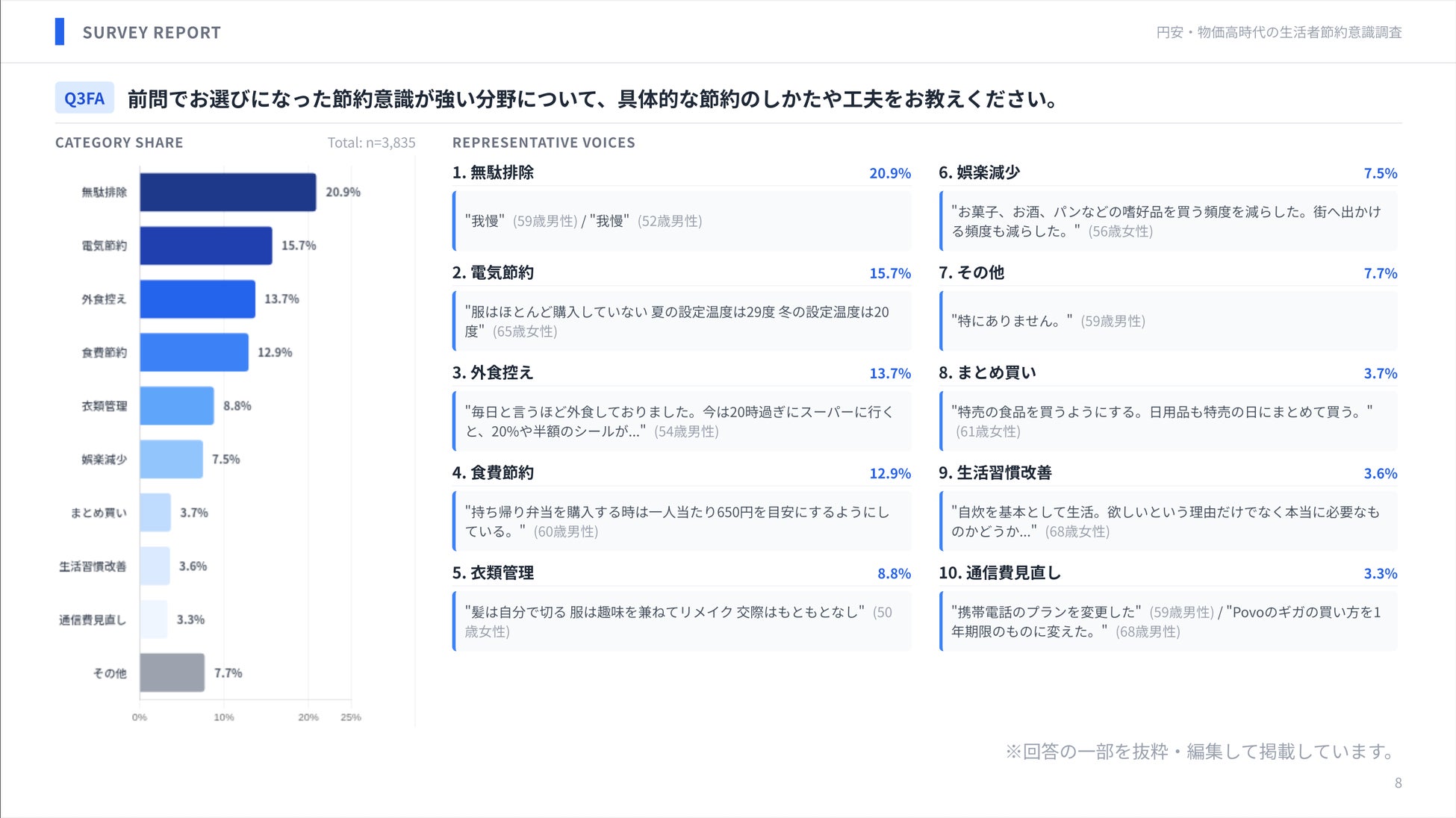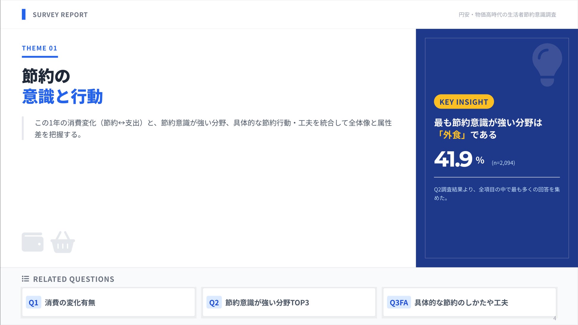 アンケート結果のローデータを送付するだけで、集計・自由回答の整理・示唆の抽出・レポート化までを一気通貫で支援。提案・会議に間に合うスピードで、マーケティングの意思決定を加速します。