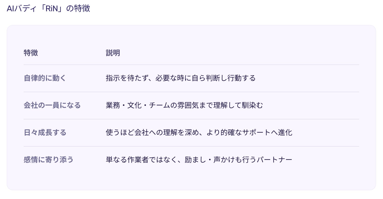 RiN Familyは、企業ごとに専属のAIバディ「RiN」を育成し、提供するサービスです。