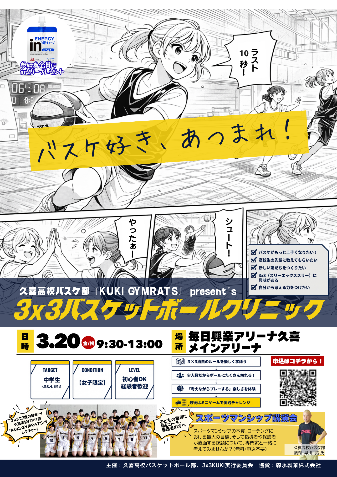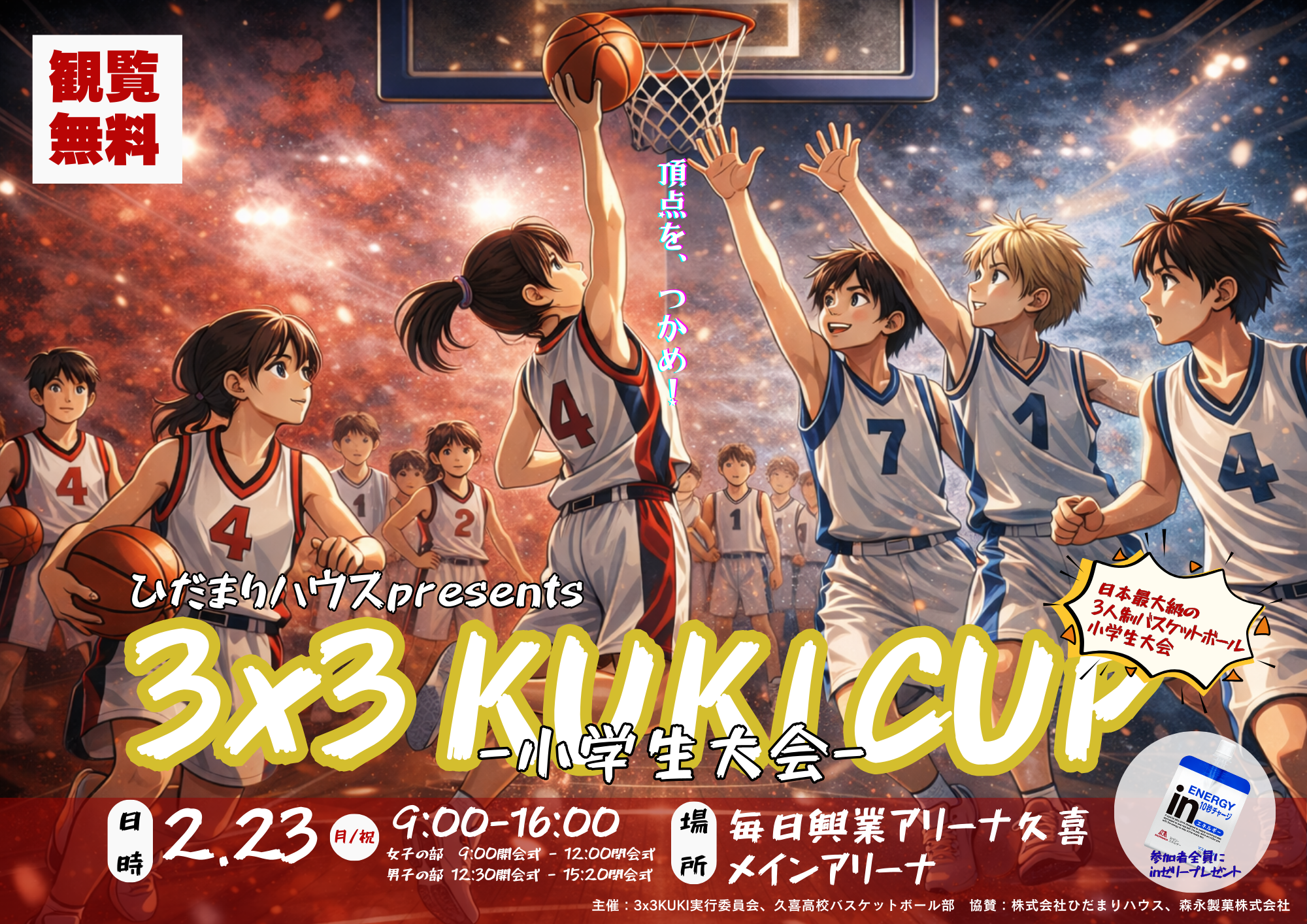 令和8年2月23日(月・祝)、埼玉県久喜市で、小学生100チーム・約400人が参加するU12 3x3大会を開催します。