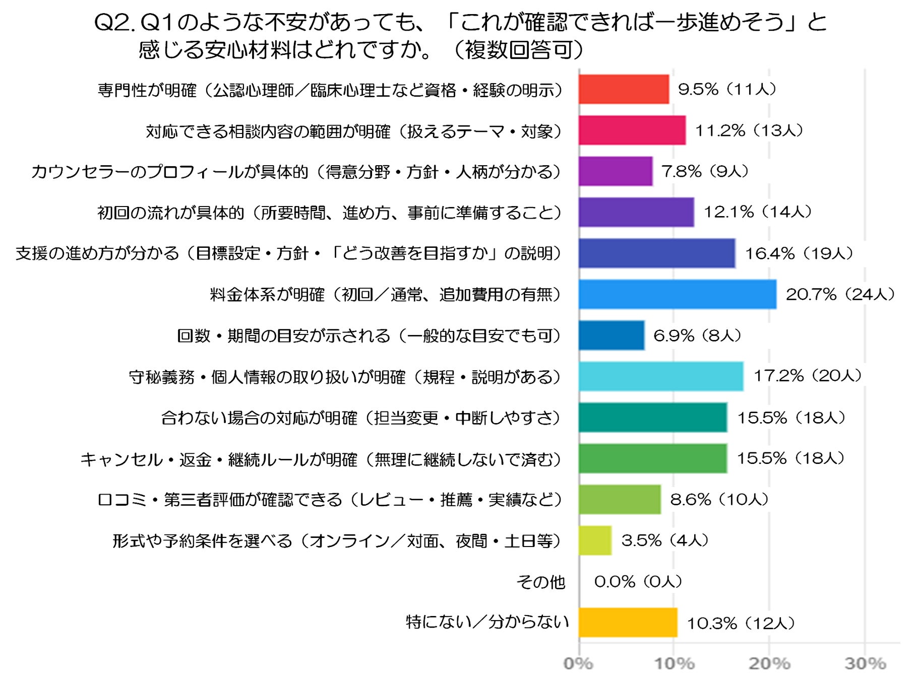 また、「合わない場合の対応が明確(担当変更・中断しやすさ)」15.5%(18人)と「キャンセル・返金・継続ルールが明確(無理に継続しないで済む)」15.5%(18人)も同率で並びました。利用前から「合わなかったときにどうできるか」が確認できると、心理的な負担が下がり、一歩進めやすくなることが読み取れます。