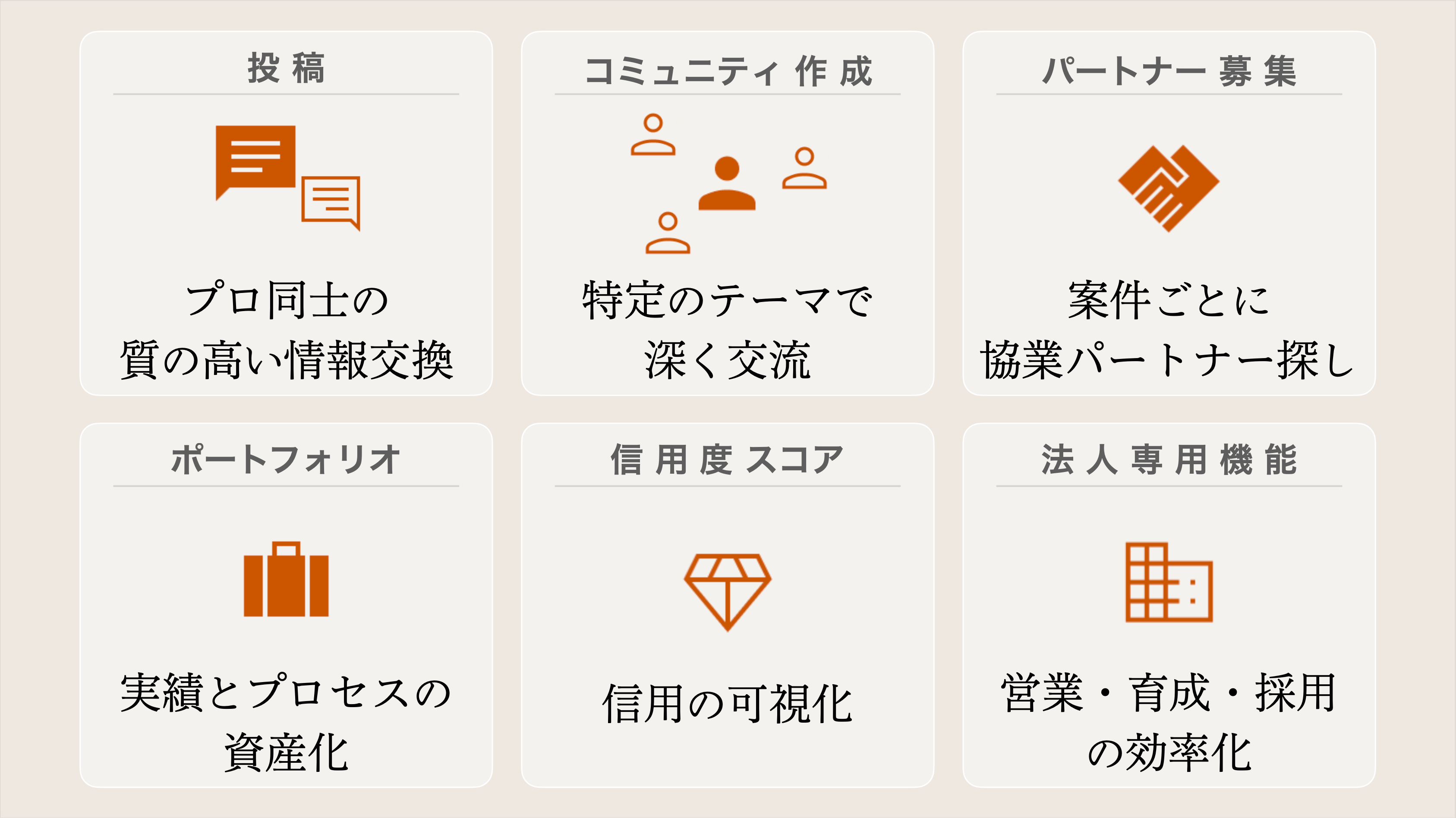 既存のSNSやチャットツールで流れてしまいがちな知見や、個々の実績・信用は、全て検索・参照可能な「業界の資産」として蓄積されます。コミュニティが成長していくほど集合知も強力になり、先人の知恵が次世代のスタートラインとなる「正の循環」を生み出します。