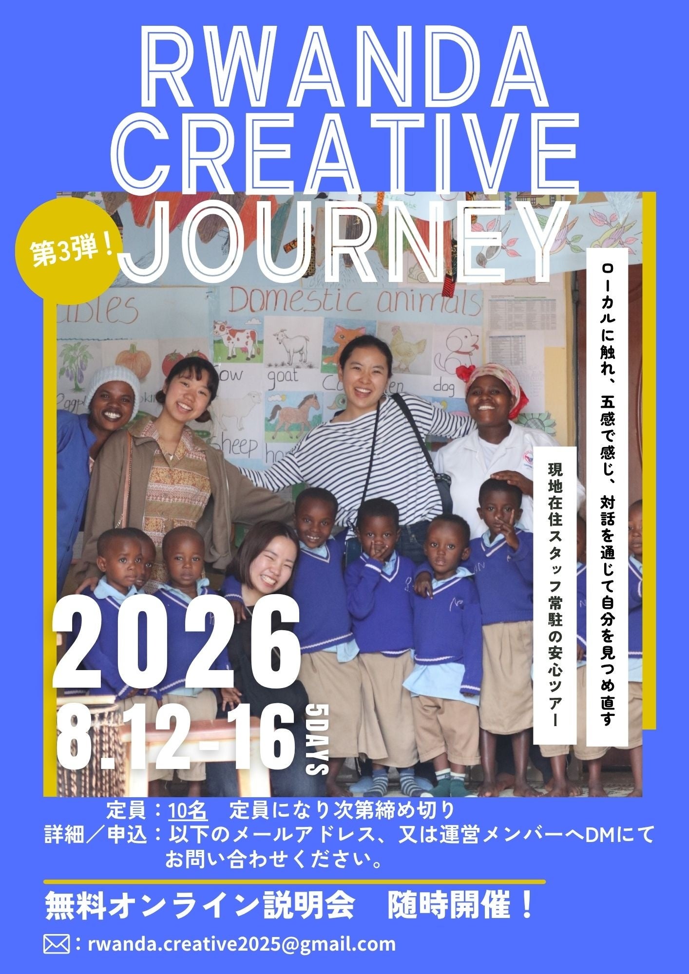 2026年8月12日(水)~16日(日)はRWANDA CREATIVE JORNEYを開催します!年齢制限はありません。夏休みの過ごし方を考えている方、漠然とアフリカに行ってみたいなって考えている方、自分の好きなことをカタチにしてみたい方、どんな思いも大切に5日間を設計します!参加ご希望の方は、上記のメールアドレスまでご連絡ください。詳細をご案内します◎
