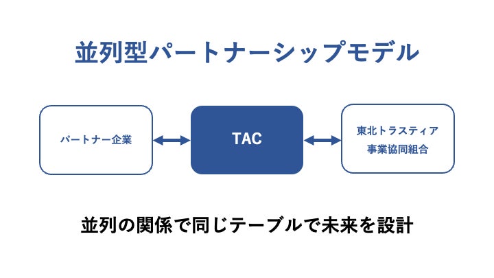 TAC、パートナー企業、ならびに設立予定の東北トラスティア事業協同組合は、いずれも独立した主体として、上下関係や従属関係に依らない「並列型パートナーシップモデル」を構築します。