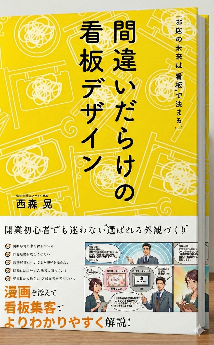 看板デザインの考え方を、実際の店舗シーンをイメージしながら理解できる構成となっており、開業準備中の方や店舗運営者でも読みやすい内容になっています。
